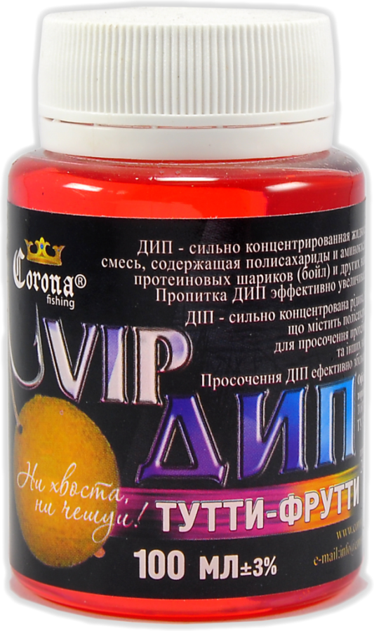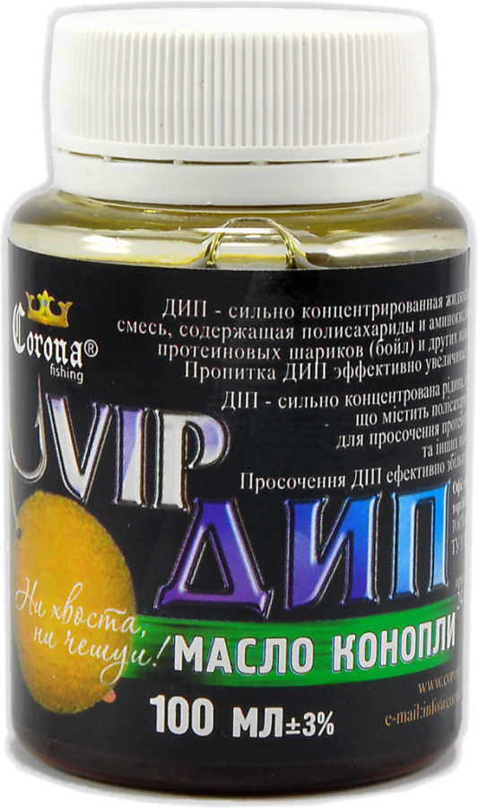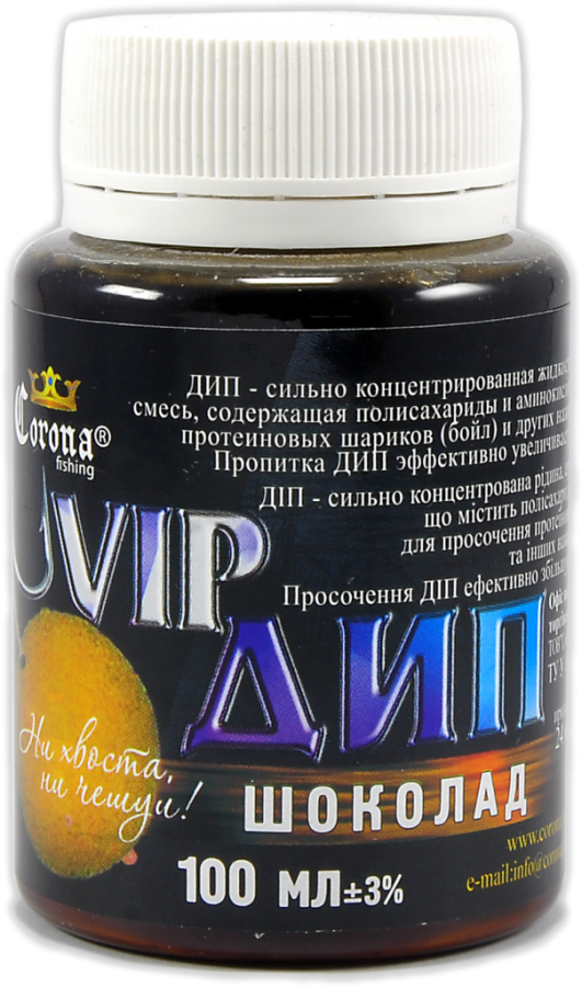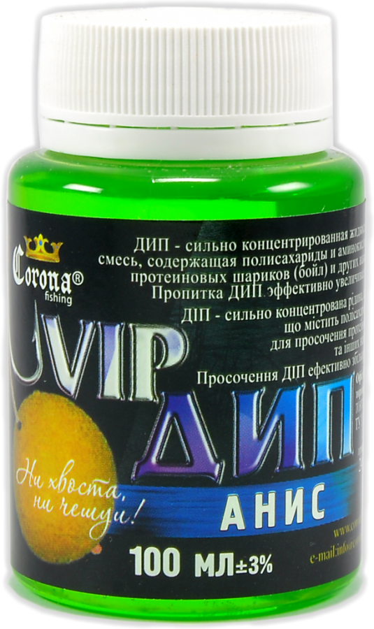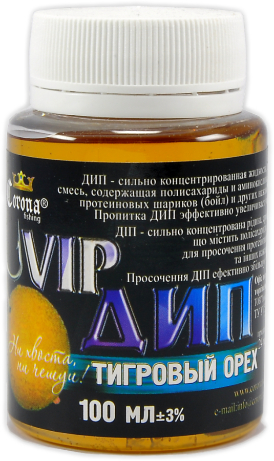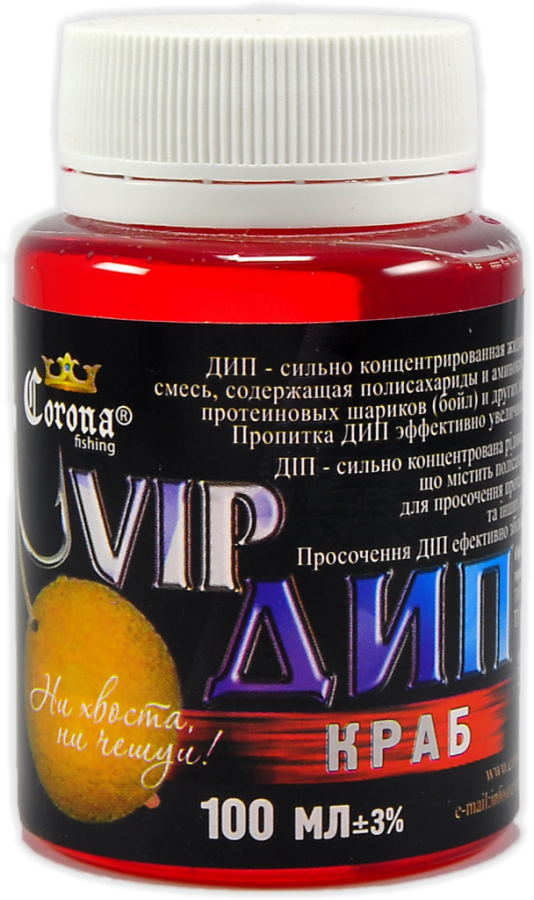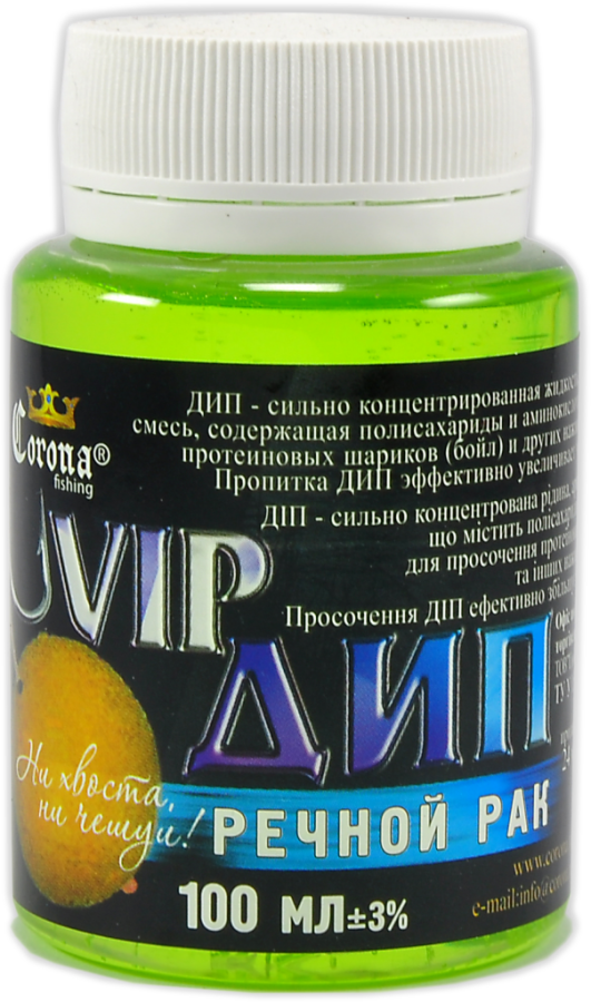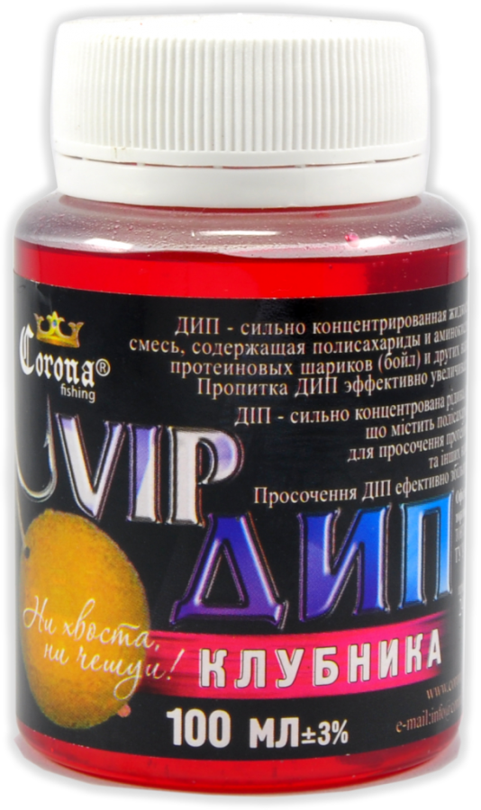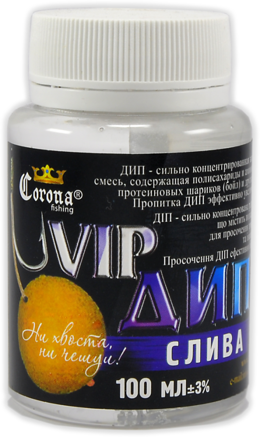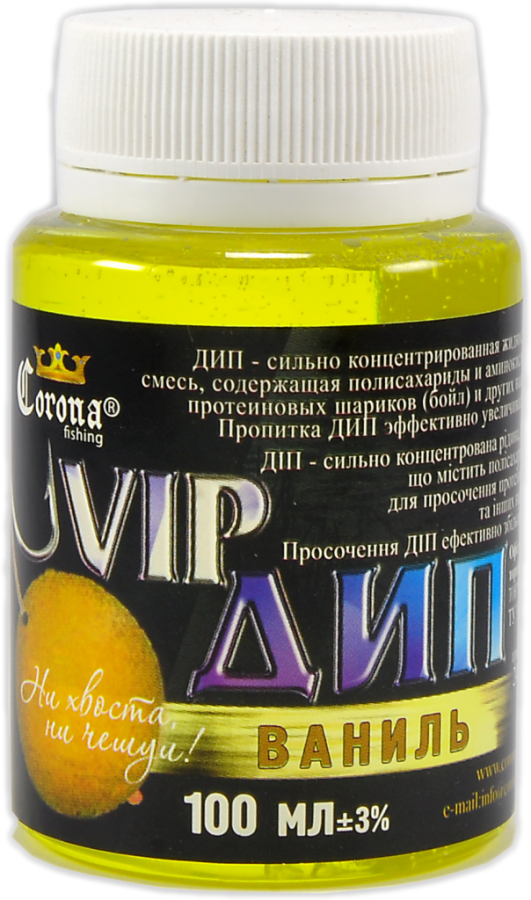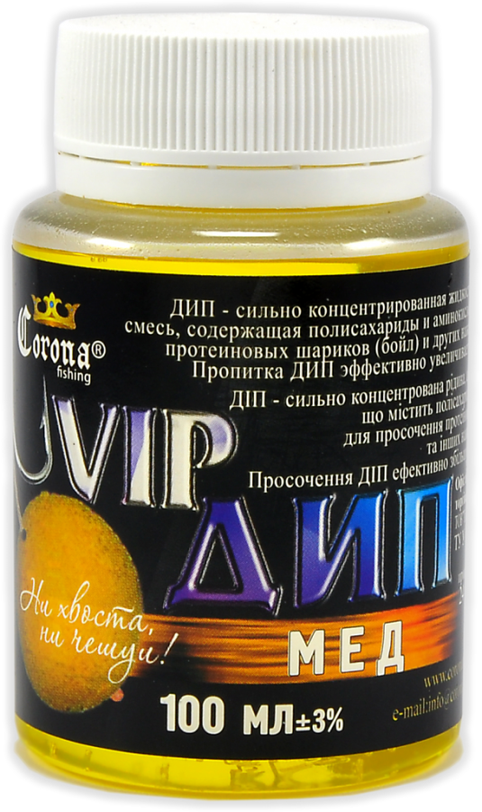 Vip Dip Corona Fishing – високоуловистий концентрат бюджетного цінового сегменту, розроблений для покращення клювання хижих видів риб. Поставляється в зручних пластикових пляшечках з широким шийкою, в яких і проводиться ароматизація.