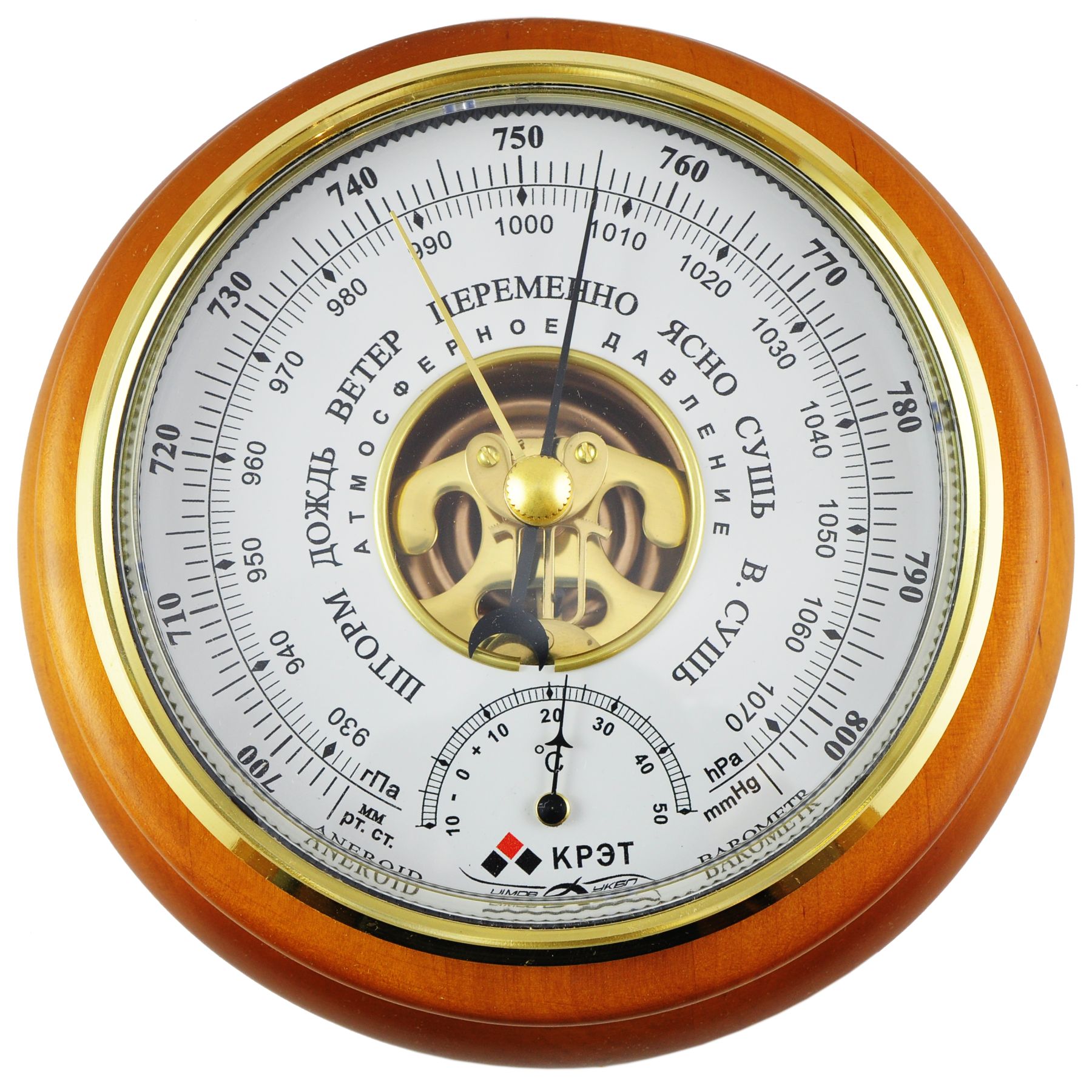 Барометр має 3 шкали: атмосферний тиск в міліметрах ртутного стовпа (від 695 до 805 мм. Рт. Зб.) І в гПа (від 927 до 1073 гПа), а також шкалу вимірювання температури.