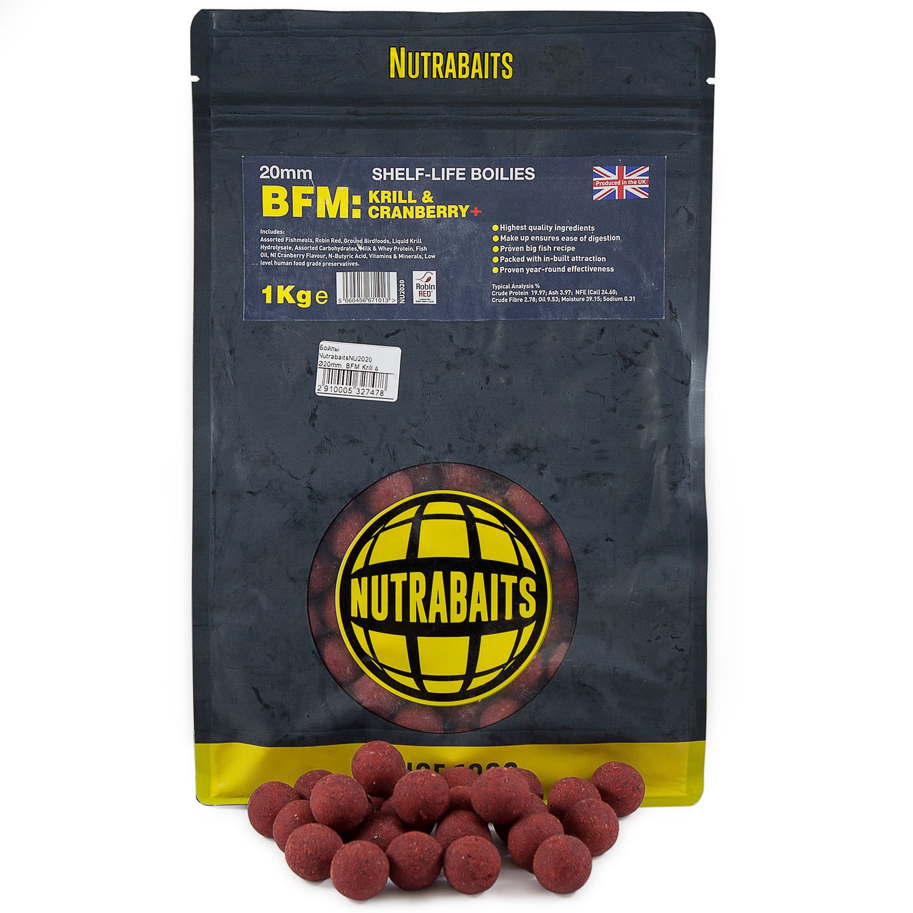 Бойли Nutrabaits BFM Krill & Cranberry - приголомшлива приманка для лову коропа, яка приносить клювання в будь-яку пору року, завдяки унікальному складу, що включає цілий комплекс високоатрактивних поживних речовин, здатних пробудити апетит навіть у ситої особини, яка не відчуває голоду.