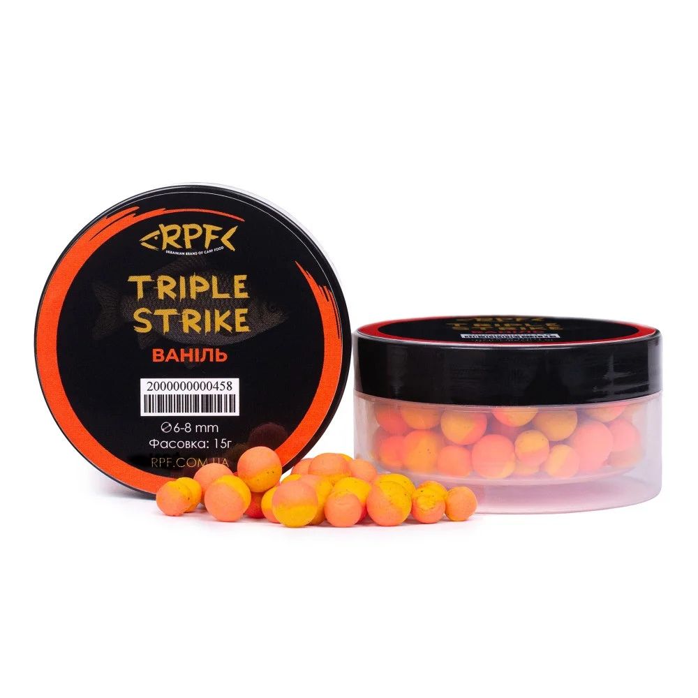 Бойли RPF Поп-ап Triple Strike це насадка круглої форми, яка має два кольори, легкий флюоро-ефект та насичений аромат. Випускаються у двох діаметрах: 6 мм та 8 мм. Мають стабільну плавучість.