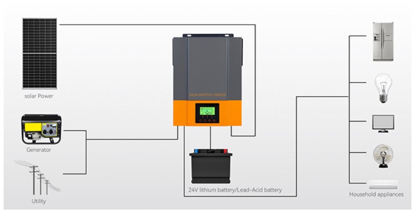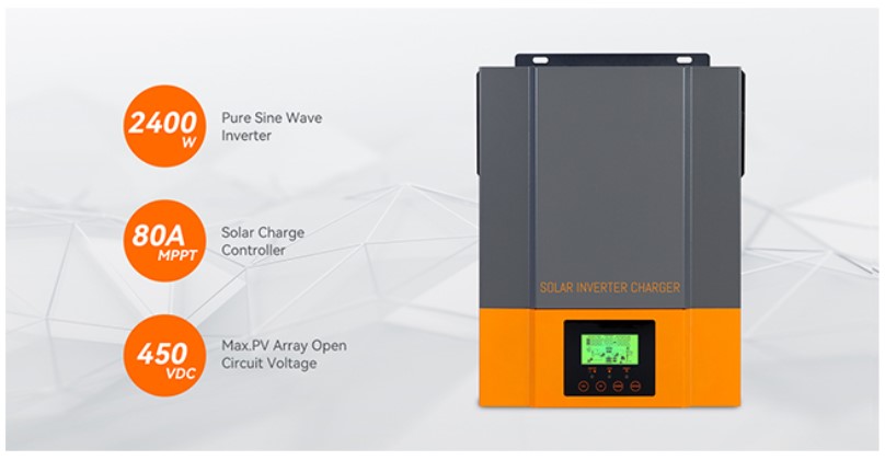 Цей інвертор має потужність 2400 Ватт та має вбудований контролер МРРТ на струм 80А. Він може працювати з будь-якими типами акумуляторних батарей із напругою 24В.