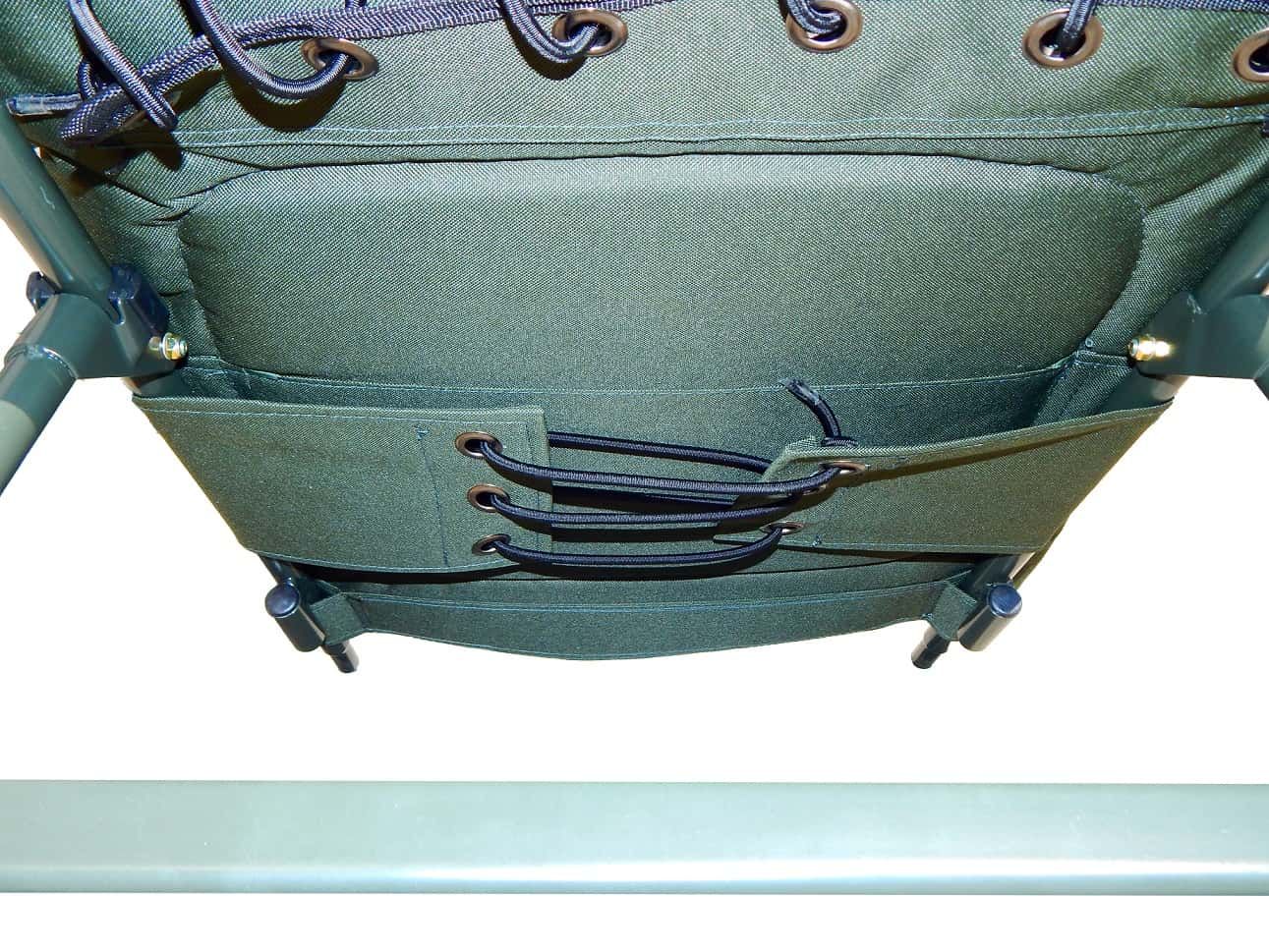 Спинка регулюється під будь-яким кутом, це можна робити, не встаючи з крісла за допомогою підлокітників. Завдяки тому, що конструкція крісла кріпиться болтами, можна легко зняти тканину для прання і без проблем кріпити обважування для риболовлі.