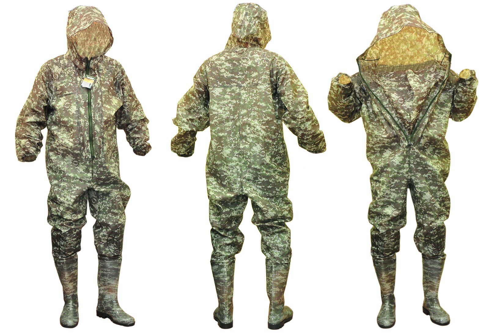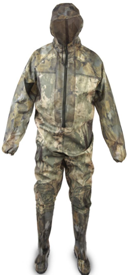 Водонепроникний рибальський комбінезон забарвлення камуфляжу. Комбінезон виготовлений на базі високих ПВХ чобіт з підошвою на товстому і глибокому протекторі, до яких струмами високої частоти приварений верх з водонепроникної вінілкожа (штучна шкіра на основі ПВХ). Шви крою верхньої частини комбінезона, також зварені високочастотними струмами, що гарантує відсутність протікання води по всій довжині комбінезона. Наколінники комбінезона посилені додаткової накладкою з вінілкожа, що робить їх більш зносостійкими і в той же час пом'якшує упор на коліно, а внутрішня ПВХ пелерина захищає тіло від вологи до рівня грудей. Конструкцією передбачені практичні кишені з внутрішньої сторони комбінезона.