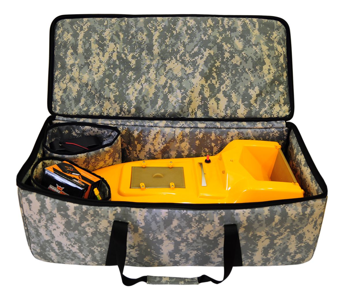 Сумка-валіза для перенесення та зберігання кораблика виготовлена з високоякісної тканини "Кордура" яка задумана для пошиття виробів військового призначення і має високу зносостійкість та міцність. Стінки, дно і кришка жорсткі, зсередини є матеріал, що амортизує і ущільнює, який щільно з усіх боків притискає кораблик не дозволяючи йому крутитися всередині валізи при перенесенні. Надійна фурнітура гарантує тривалий термін бездоганної роботи.