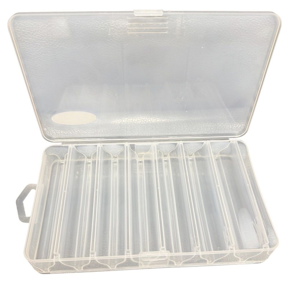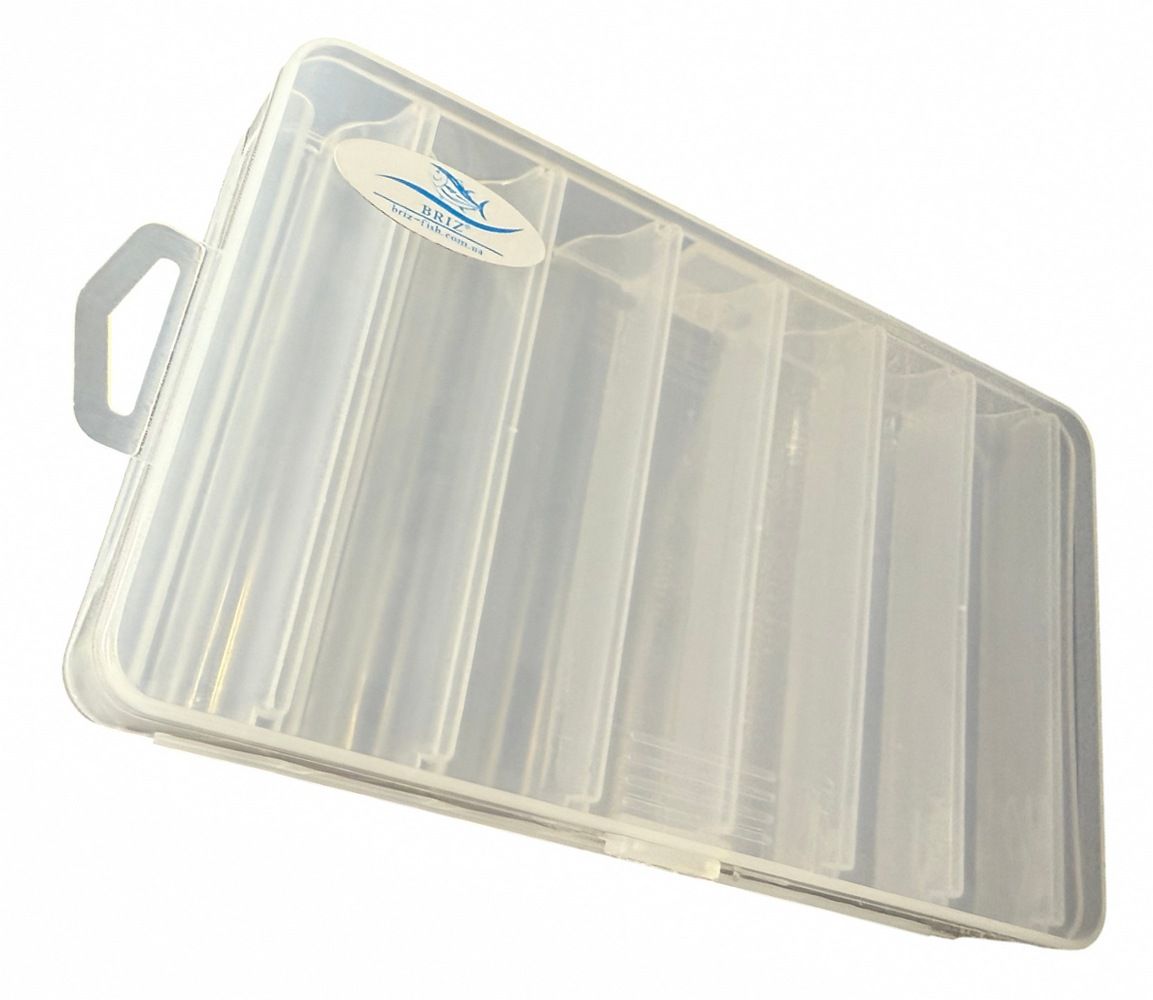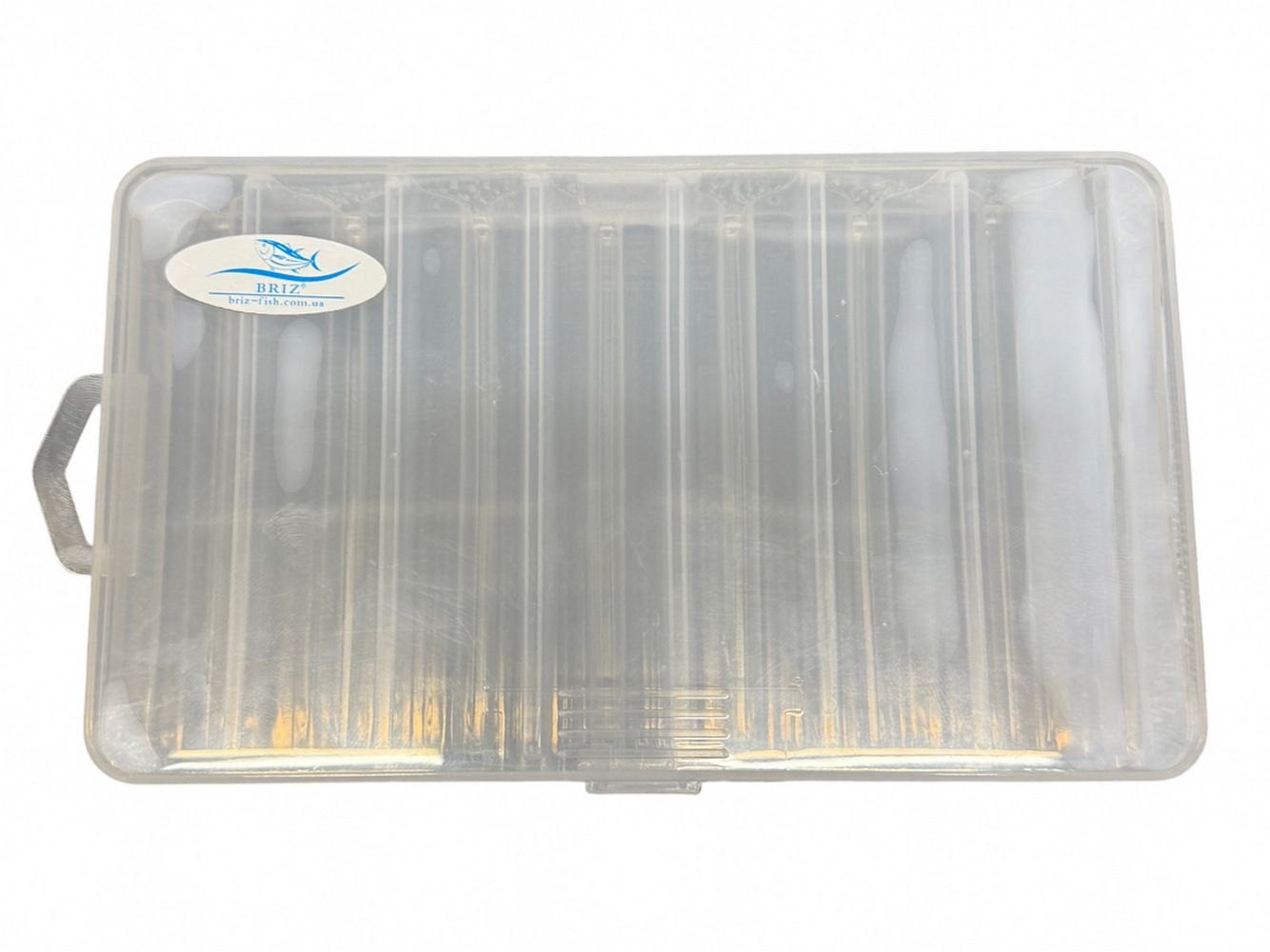 Коробка Briz 005 - прозора двостороння коробка для зберігання та транспортування воблерів та блешень. Має 14 осередків (7 з одного та 7 з іншого боку) для зберігання воблерів максимальним розміром 110 мм.