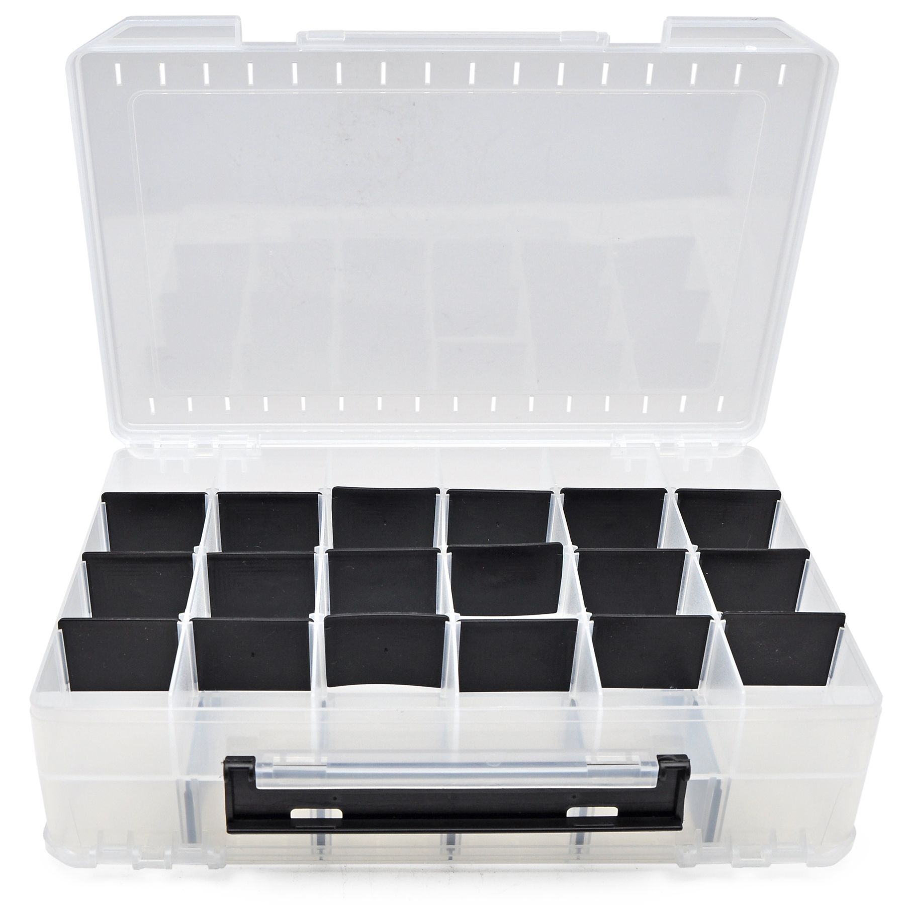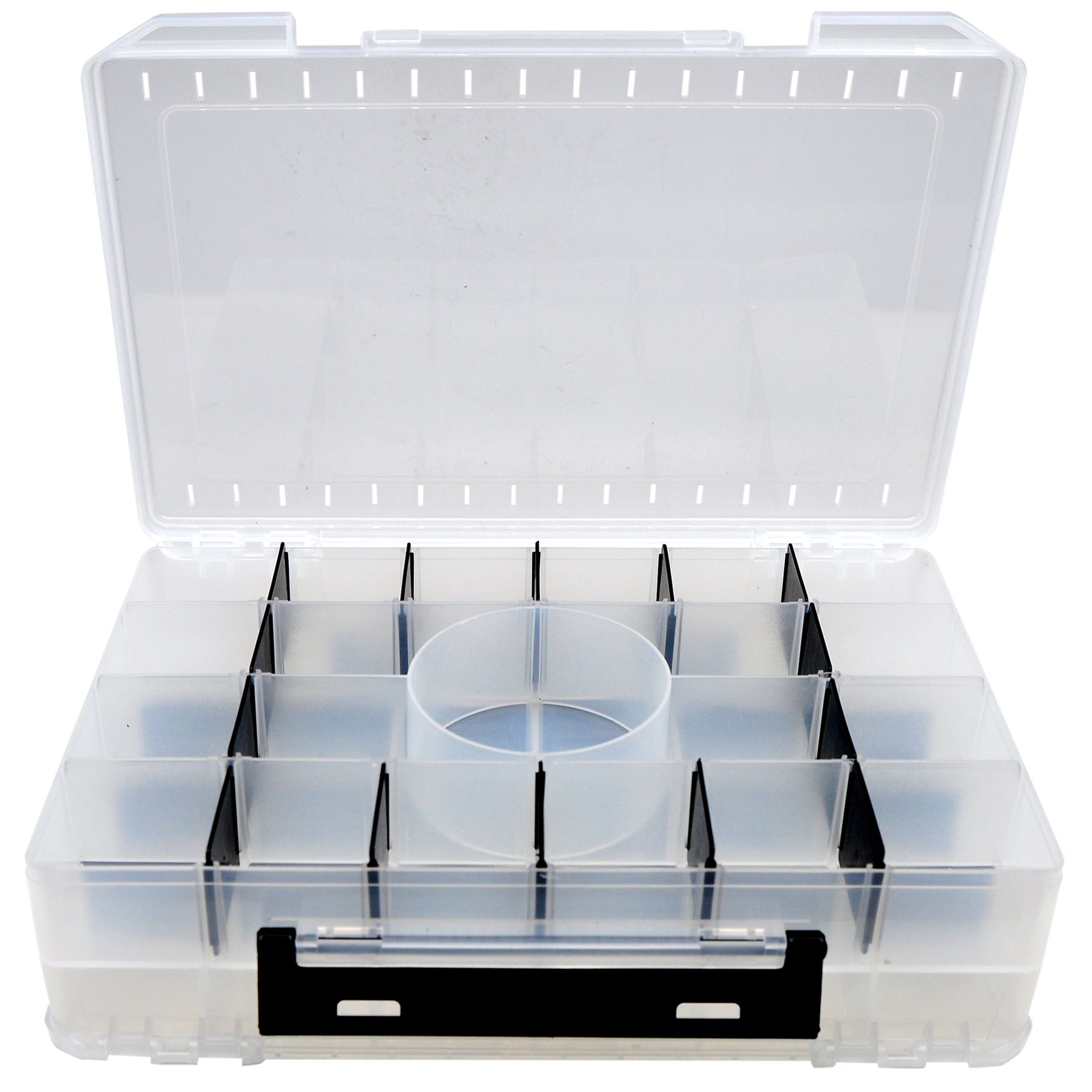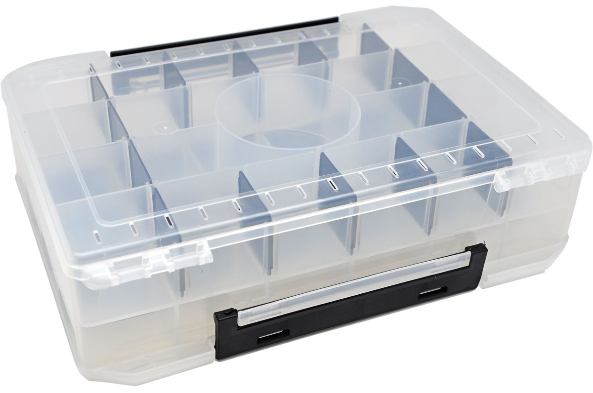 Надійні фіксатори замків, продумана ергономіка. Відкривається з двох сторін. Коробка не боїться ударів. Прозорий корпус дозволяє підібрати потрібний воблер перед її розкриттям. А перегородки допоможуть воблерам уникнути пошкоджень під час транспортування.