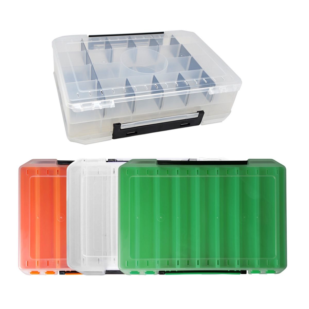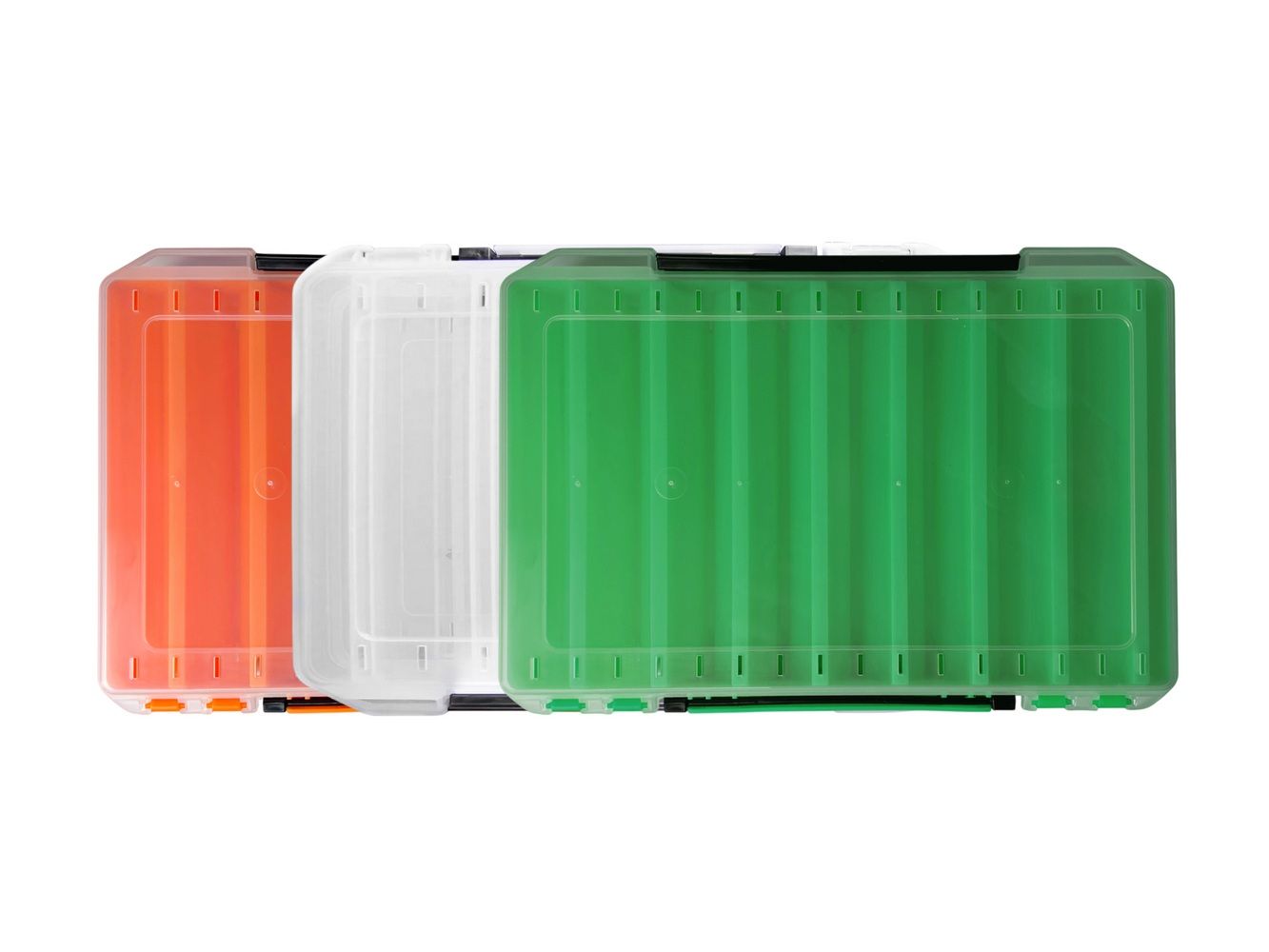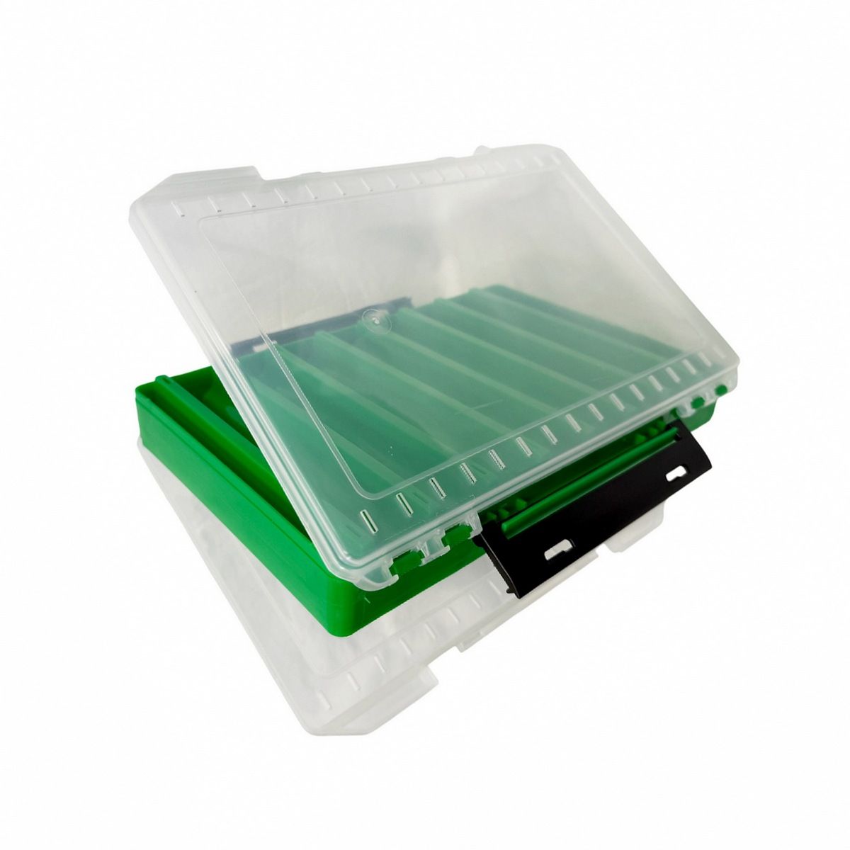 Надійні фіксатори замків, продумана ергономіка. Відкривається з двох сторін. Коробка не боїться ударів. Прозорий корпус дозволяє підібрати потрібний воблер перед її розкриттям. А перегородки допоможуть воблерам уникнути пошкоджень під час транспортування.