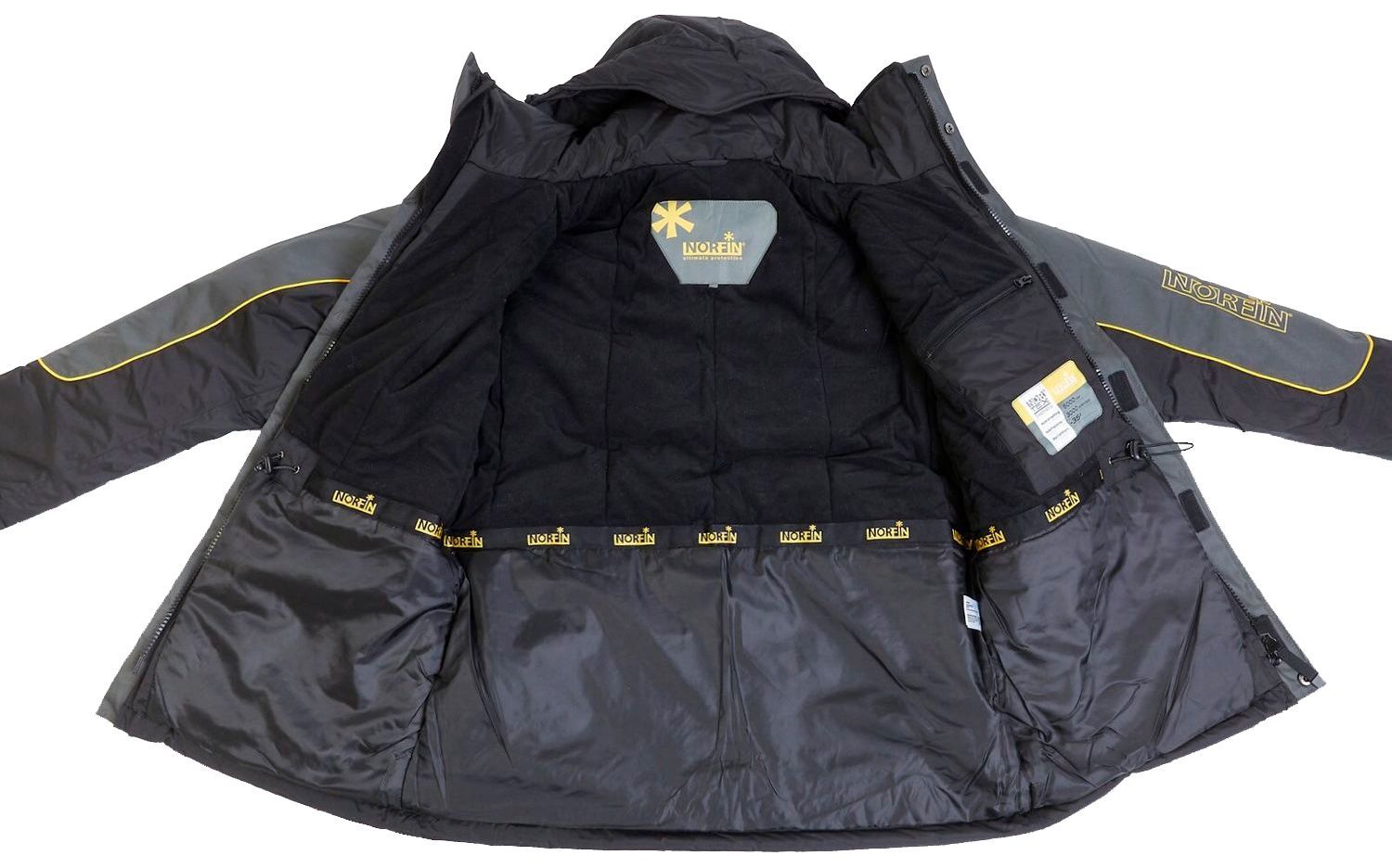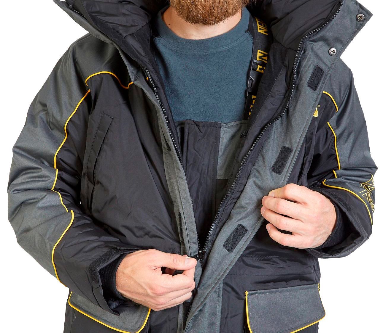 - Куртка. Капюшон щільний, всередині додатково утеплений шаром флісу, має спеціальний козирок і регулюється у двох місцях. Високий комір куртки та повністю застебнутий капюшон дозволить відчувати себе, як в теплій наметі, навіть в умовах низьких температур, опадів і сильного вітру. Зовні чотири кишені - дві внизу і дві на рівні пояса. Вони місткі, мають спеціальні захисні козирки та прогумовану блискавку. Для телефону та особистих речей є сітчастий внутрішню кишеню. Нижні зовнішні кишені додатково затягуються гумкою. Основна блискавка надійна, має два замки та додатково закривається тканинною планкою на липучках. На рукавах є щільні манжети, а область попереку утеплена додатково.