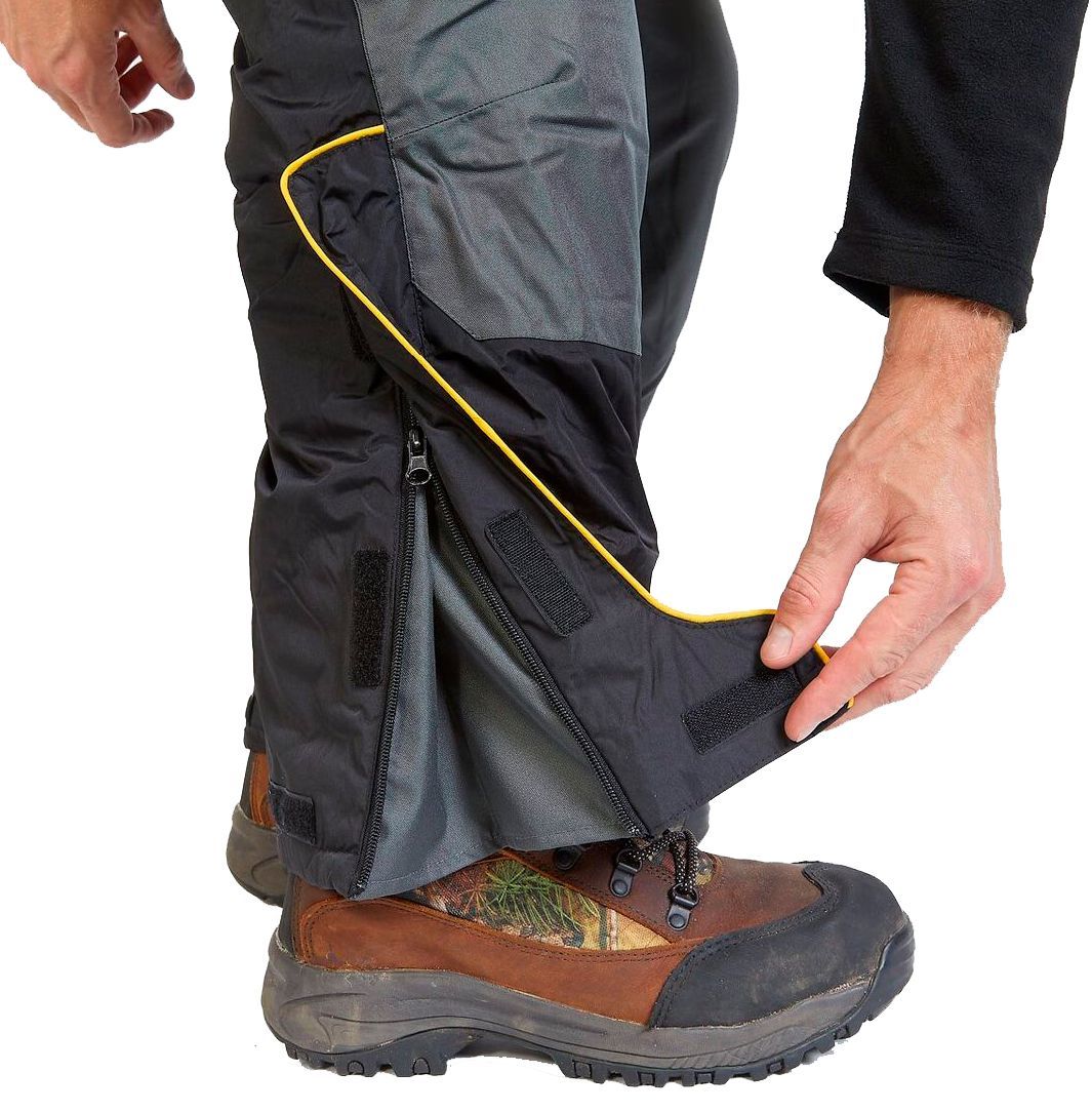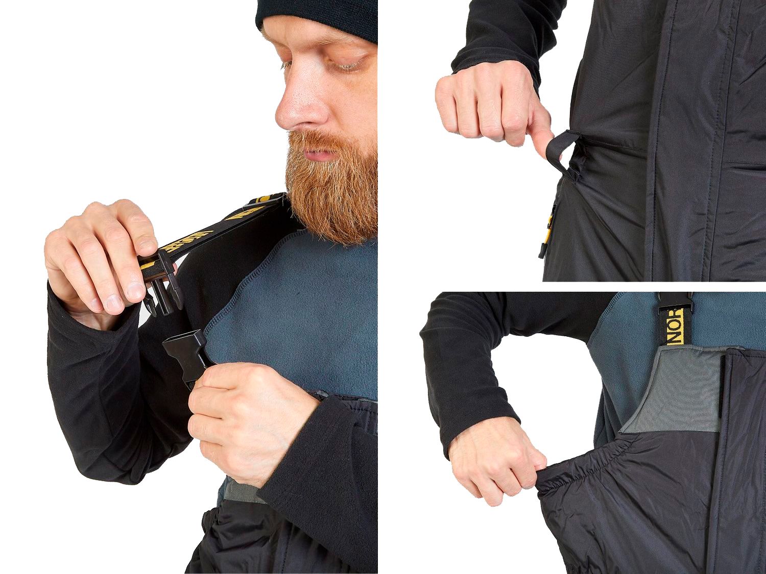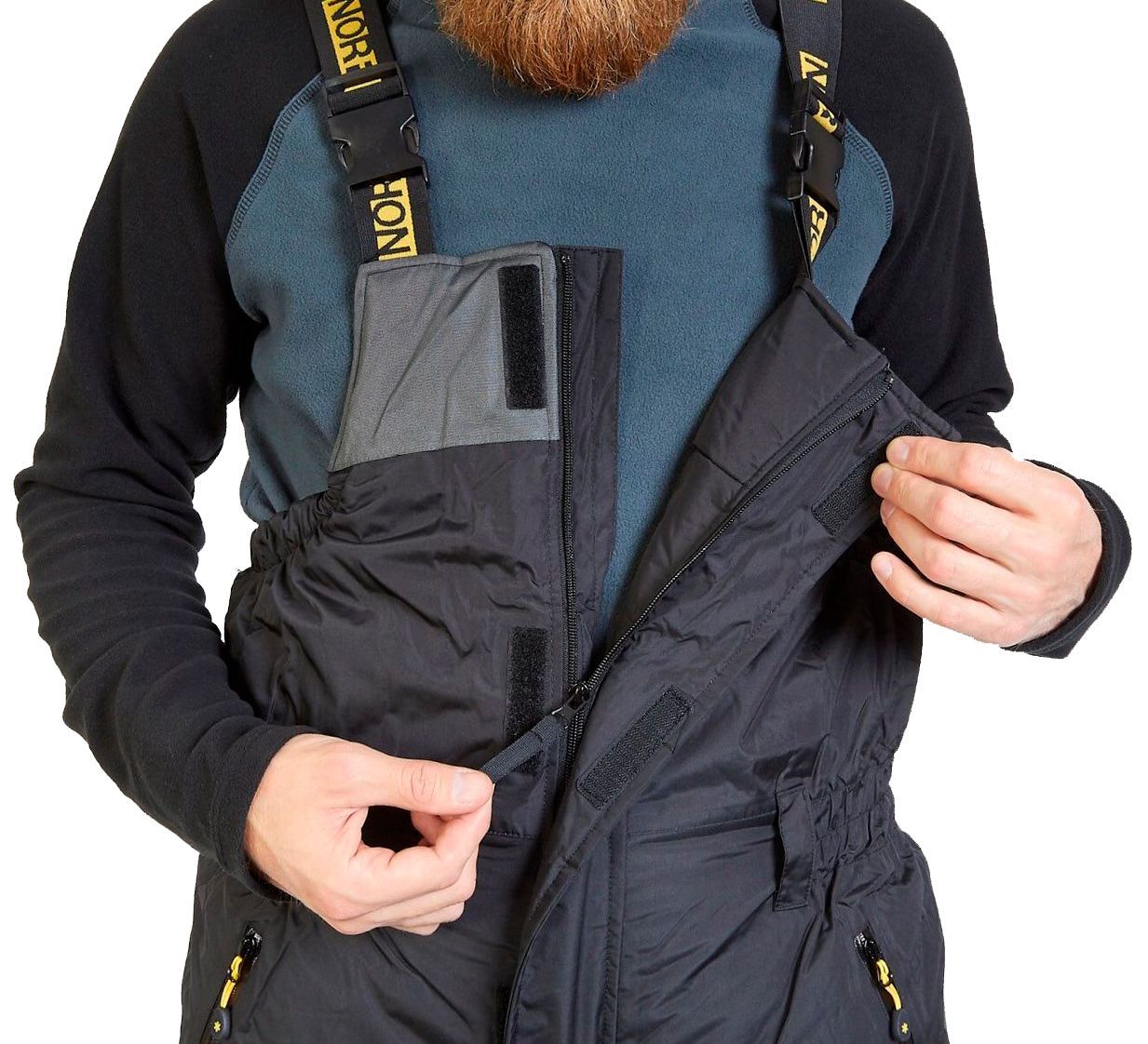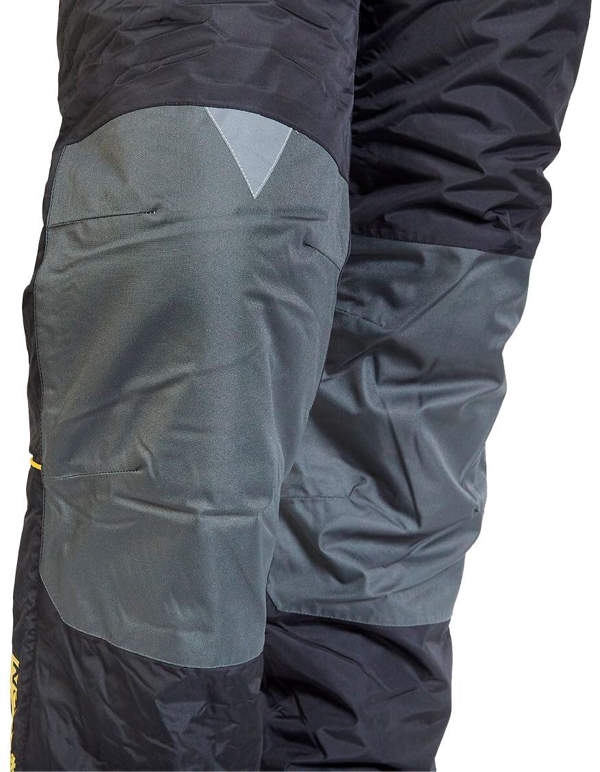 - Напівкомбінезон. Має регульовані лямки та шлейки для ременя. На поясі він затягується - це повністю захищає від попадання холодного повітря під одяг. На колошах є дві кишені з прогумованими блискавками. Області колін і сідниці ущільнені додатково. Нижня частина штанин має приховану блискавку, що дозволяє носити костюм навіть на об'ємну взуття або надягати його, не знімаючи черевик.