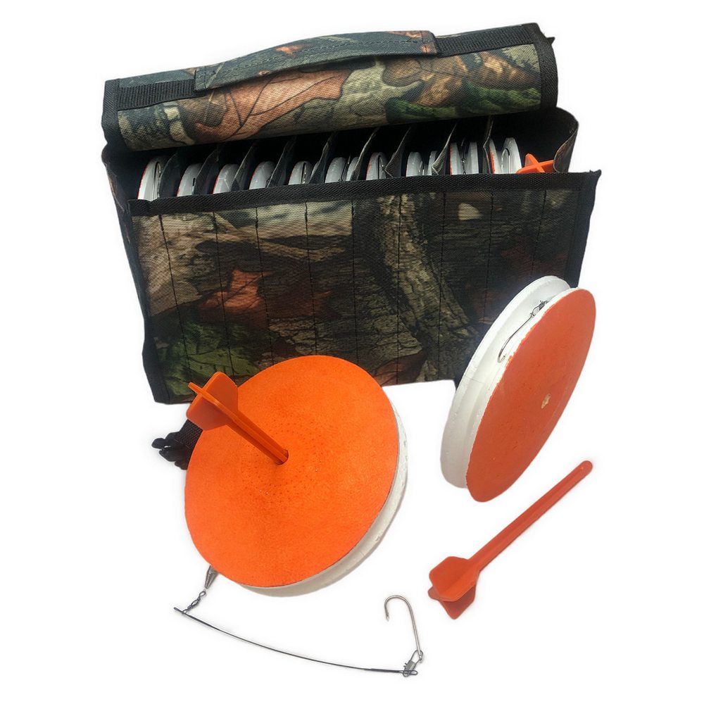 Кружки рибальські купити найкраще набором по 10 штук у зручній непромокальній сумці. Сумка має 10 вертикальних секцій, надійні застібки та ручку для перенесення. Ви можете виходячи зі своїх переваг вибрати забарвлення сумки - від яскравого до камуфльованого.