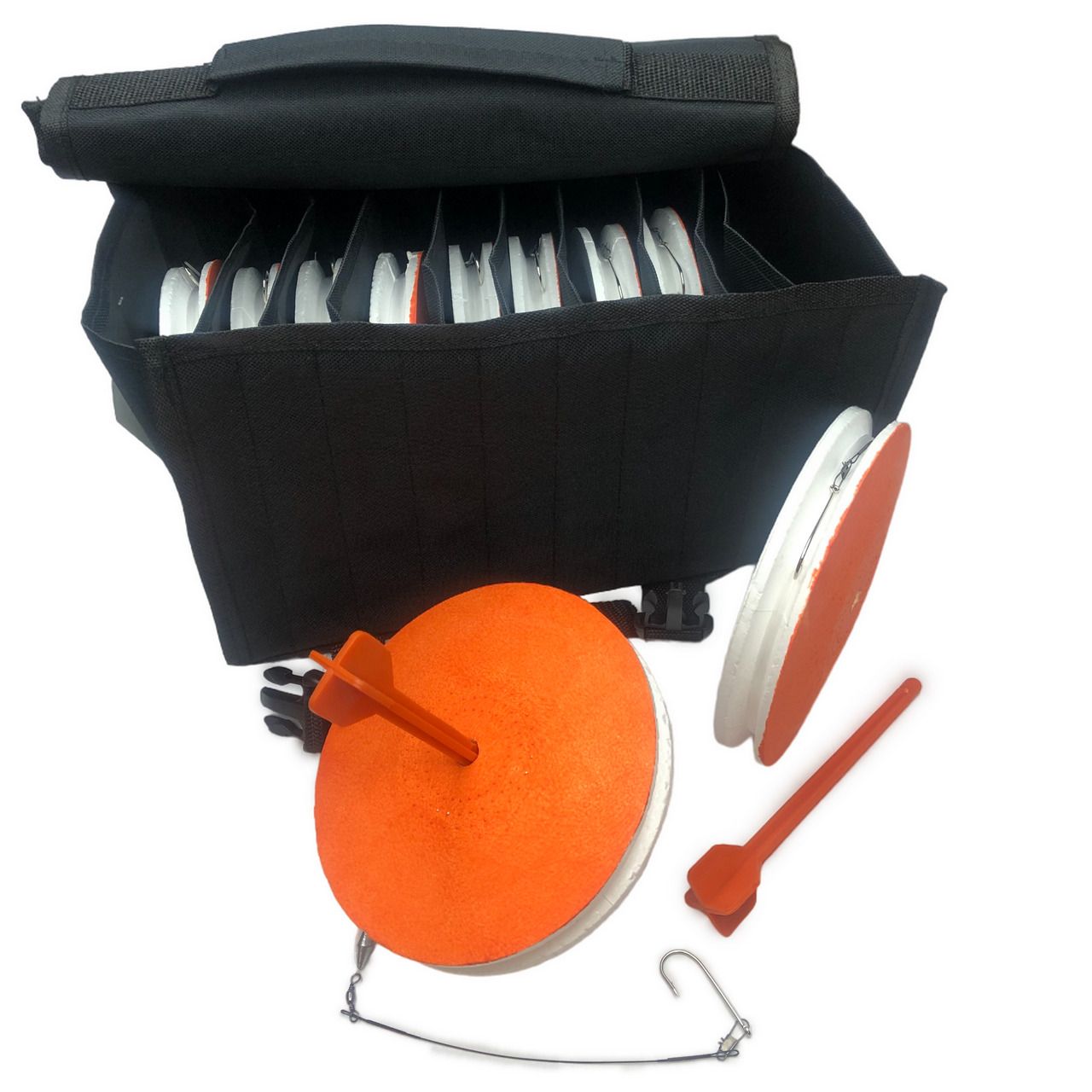 Кружки рибальські купити найкраще набором по 10 штук у зручній непромокальній сумці. Сумка має 10 вертикальних секцій, надійні застібки та ручку для перенесення. Ви можете виходячи зі своїх переваг вибрати забарвлення сумки - від яскравого до камуфльованого.