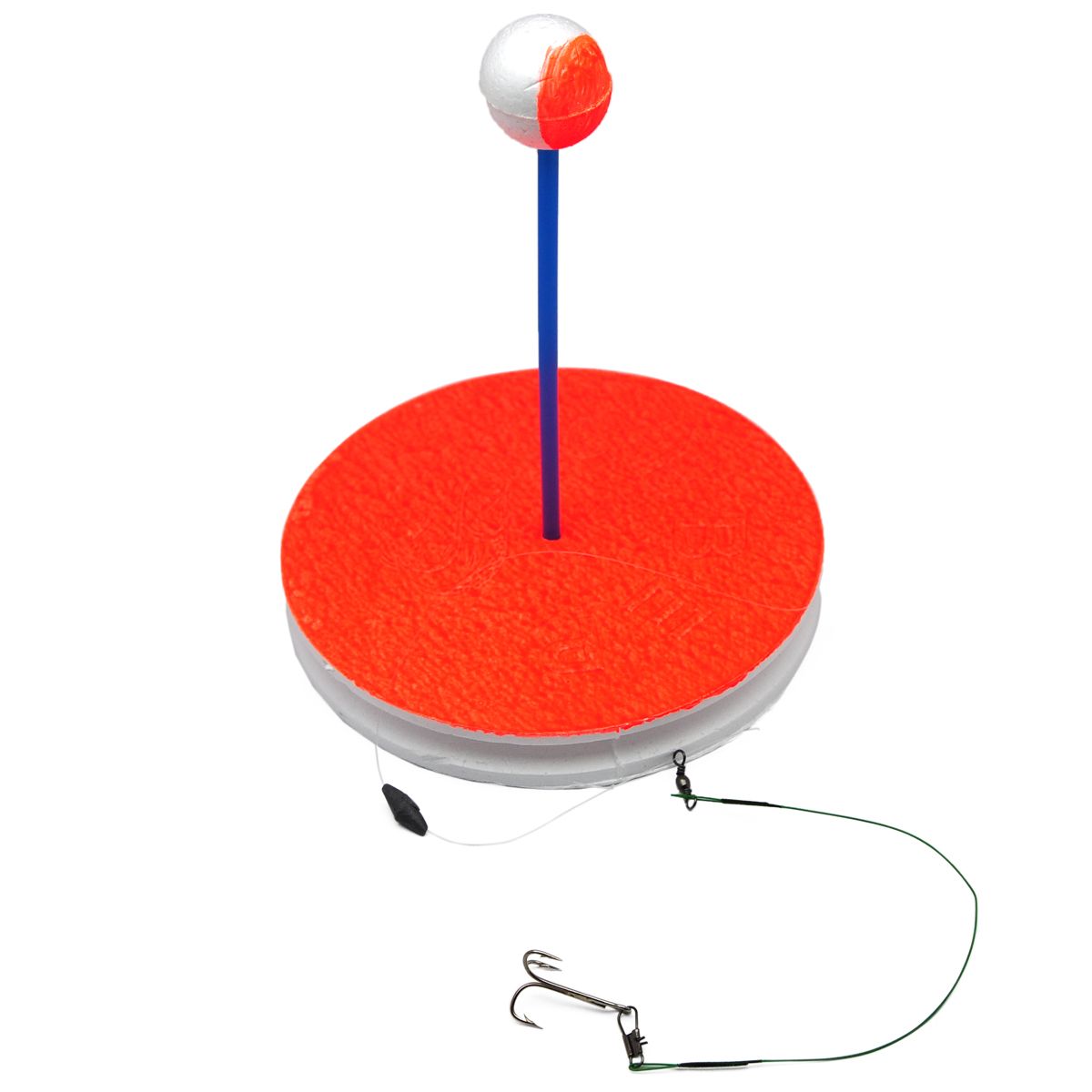 Гурток рибальський виготовлений з пінопласту діаметром 15 см і товщиною 2 см. В центрі гуртка отвір для установки пластмасової палички на верхньому кінці якої буде знаходитися кулька на половину пофарбована яскравим кольором. Це потрібно для сигналізації клювання. Коли кружок рибальський почне обертатися кулька буде повертатися по черзі пофарбованою і нефарбованою стороною і привертати увагу рибалки.