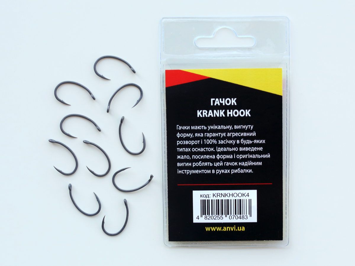 Гачки коропові Anvi Krank Hook виготовлені з високовуглецевої сталі, з використанням захисних покриттів, що оберігають їх від корозій. Ідеально гострі гачки, що володіють невисокою ціною і широким вибором розмірів.