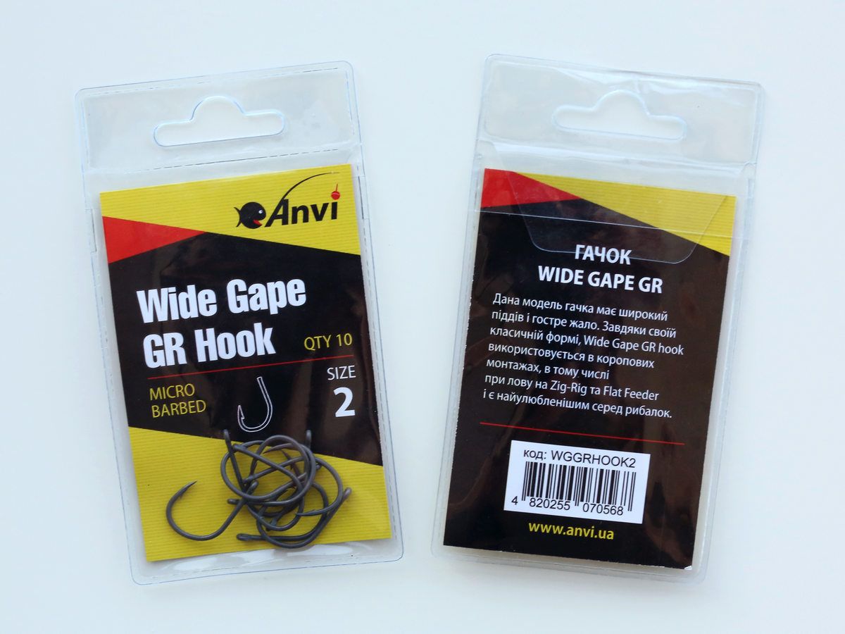 Гачки коропові Anvi Wide Gape GR Hook представлені в розмірах №2, №4, №6, №8 та №10.