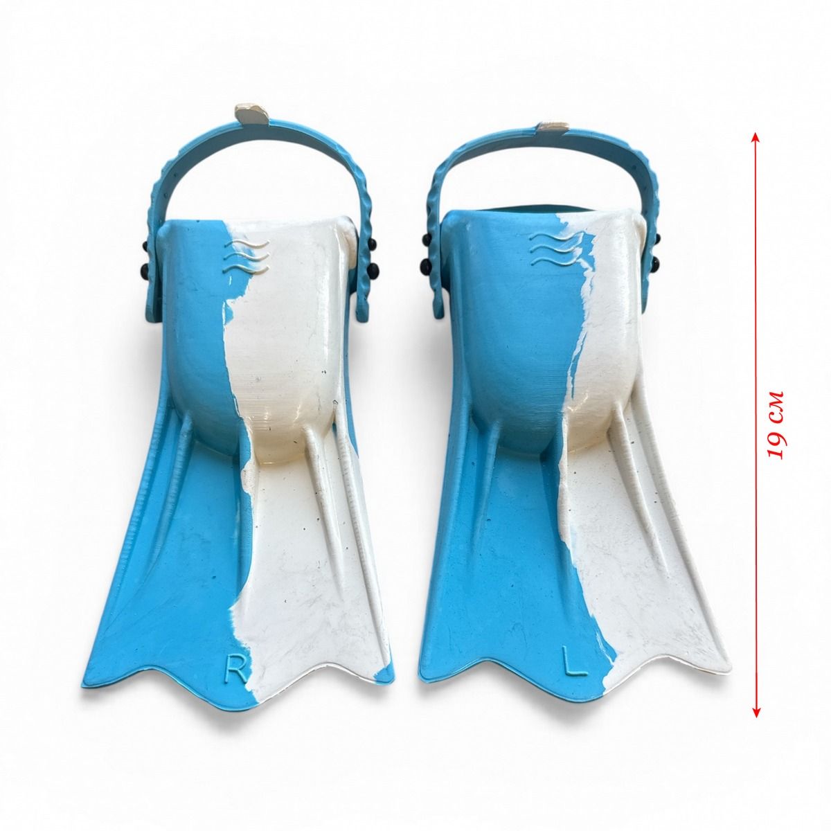 Фіксація стопи здійснюється зручною гумкою довжиною 20 см, з 12 отворами для фіксації (по 6 отворів на кожному кінці гумки). У комплекті ласта на ліву та ласта на праву ноги, позначені L та R.