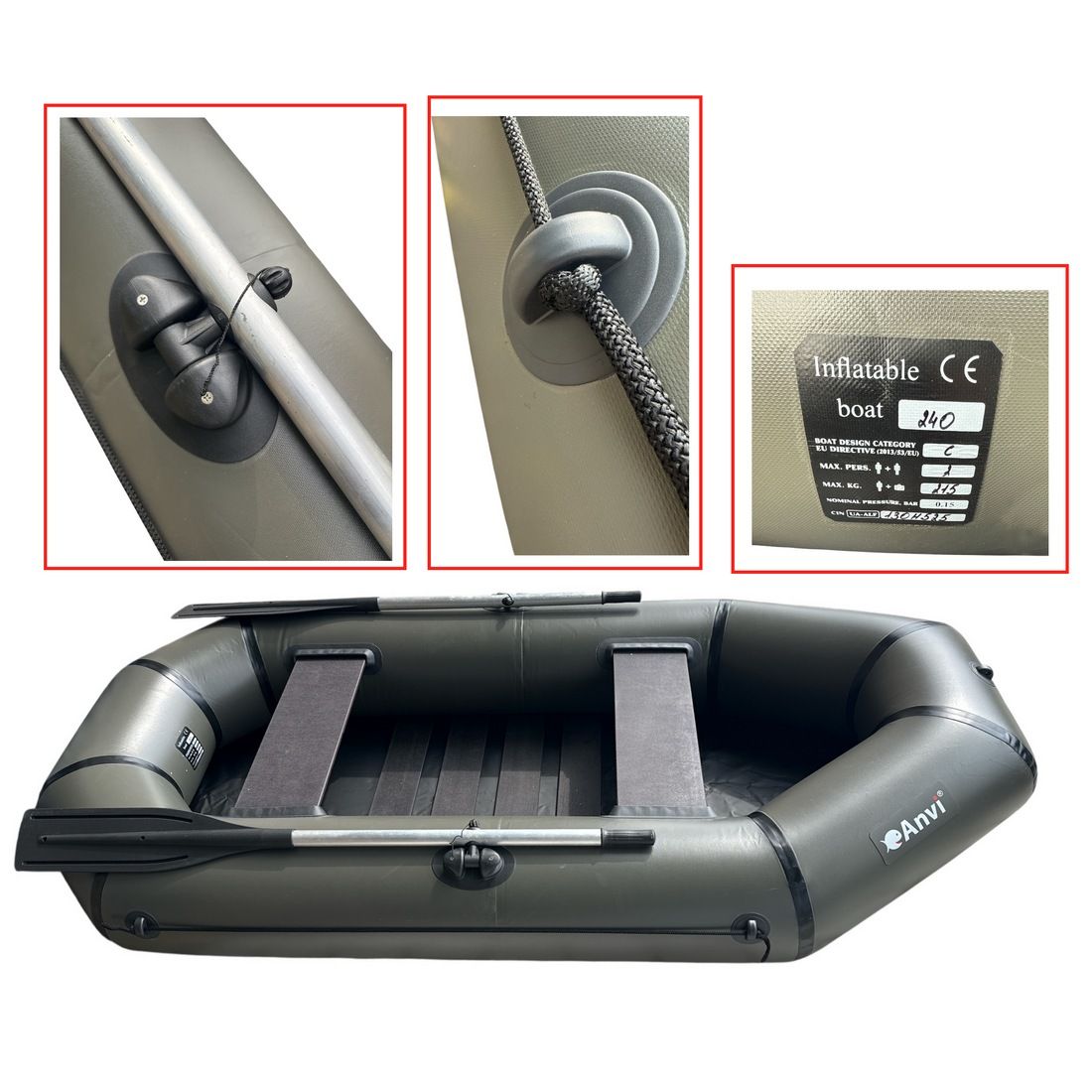 Човен надувний Anvi 240 LS - легкий і компактний, універсальний двомісний гребний човен, створений для риболовлі, полювання та відпочинку на воді. Виготовлений з міцного армованого ПВХ підвищеної щільності, стійкого до проколів, дії сонця та зносу. Завдяки надійній конструкції та оптимальній формі днища, човен забезпечує надійність, безпеку та відмінну стійкість та керованість на воді, навіть при хвилі чи переміщенні пасажирів.