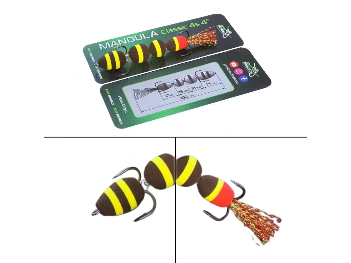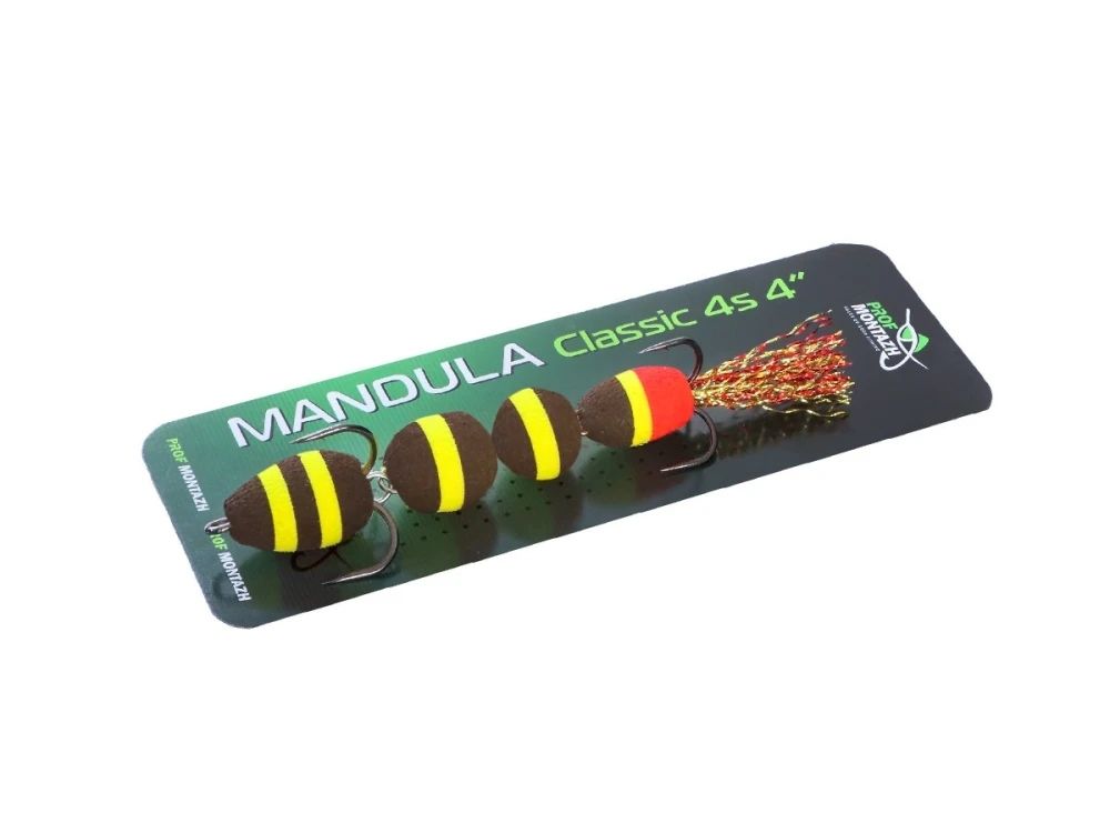 Мандула Classic 4S 4" (100 мм) - складається з 4 сегментів кулястої форми - це надає приманці підвищену рухливість у воді. Оснащується двома гострими трійниками номер 2 і 4. Опушка на хвості з якісного люрексу, який на етапі виготовлення мандули додатково розпушується вручну.