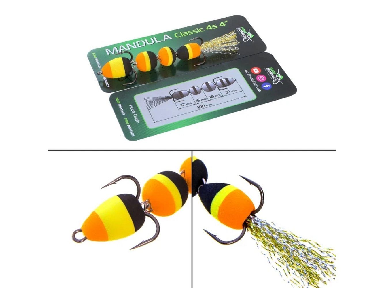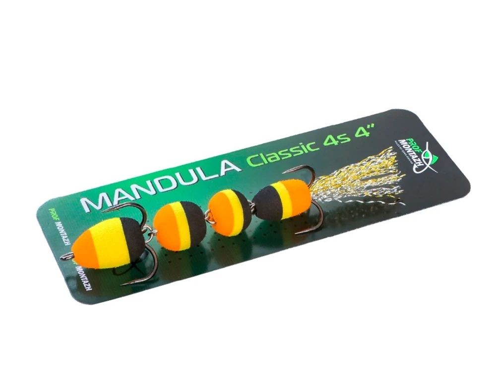 Мандула Classic 4S 4" (100 мм) - складається з 4 сегментів кулястої форми - це надає приманці підвищену рухливість у воді. Оснащується двома гострими трійниками номер 2 і 4. Опушка на хвості з якісного люрексу, який на етапі виготовлення мандули додатково розпушується вручну.