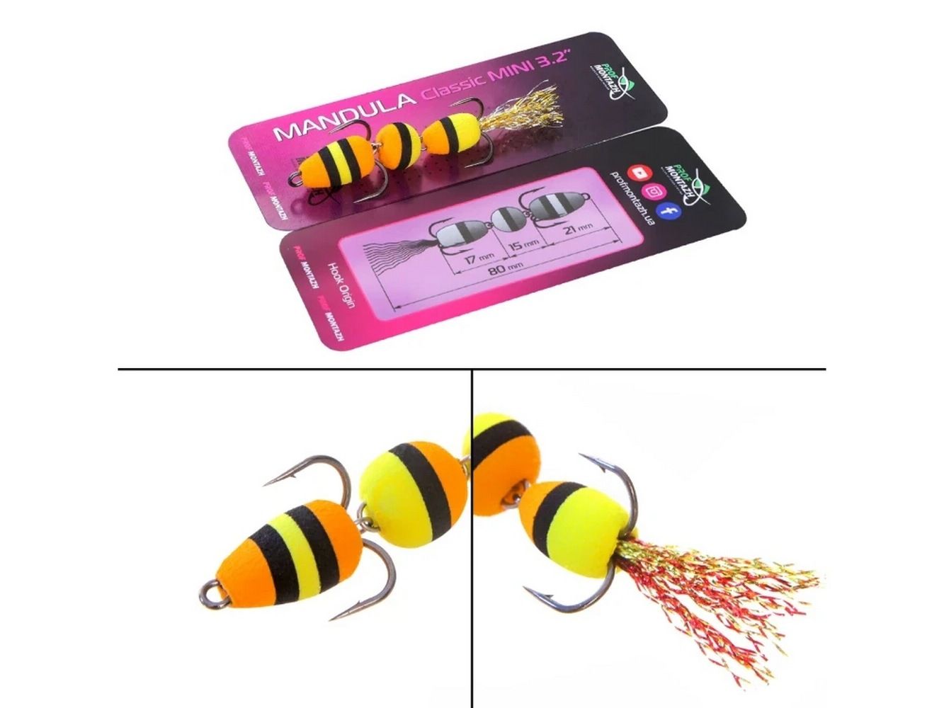 Mandula Classic Mini 3,2" (80 мм) - виготовлена з 3 сегментів кулястої форми. Кожен сегмент між собою скріплюється міцним нержавіючим дротом діаметром 0,8 мм. Вся серія Classic відрізняється надійністю і міццю. Оснащується двома гострими трійниками номер 2 і 4. Опушка на хвості з якісного люрексу, який на етапі виготовлення мандули додатково розпушується вручну.