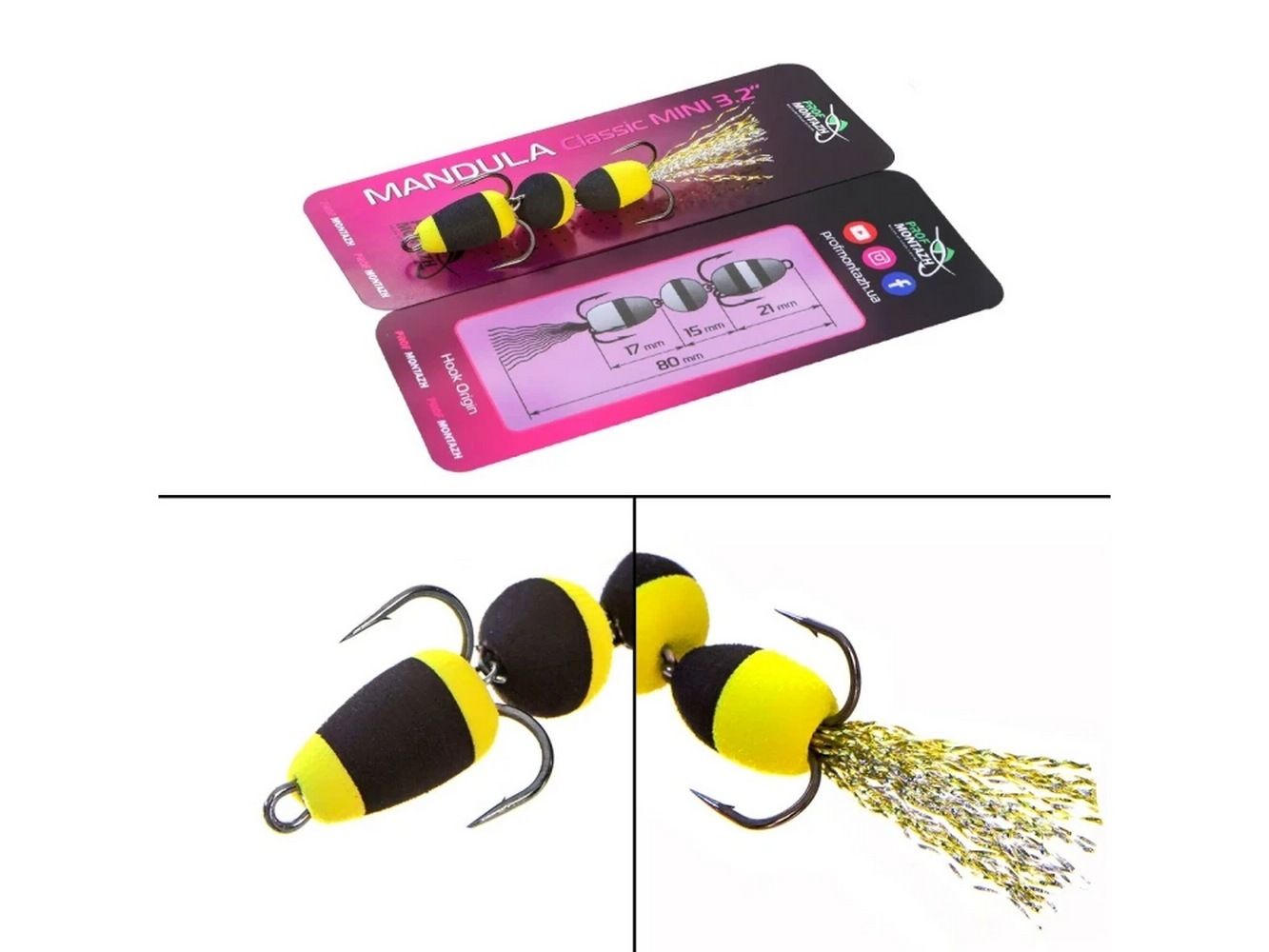 Mandula Classic Mini 3,2" (80 мм) - виготовлена з 3 сегментів кулястої форми. Кожен сегмент між собою скріплюється міцним нержавіючим дротом діаметром 0,8 мм. Вся серія Classic відрізняється надійністю і міццю. Оснащується двома гострими трійниками номер 2 і 4. Опушка на хвості з якісного люрексу, який на етапі виготовлення мандули додатково розпушується вручну.
