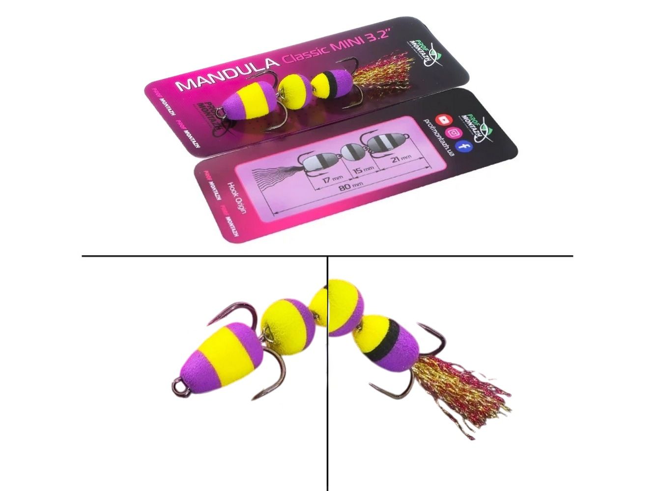 Mandula Classic Mini 3,2" (80 мм) - виготовлена з 3 сегментів кулястої форми. Кожен сегмент між собою скріплюється міцним нержавіючим дротом діаметром 0,8 мм. Вся серія Classic відрізняється надійністю і міццю. Оснащується двома гострими трійниками номер 2 і 4. Опушка на хвості з якісного люрексу, який на етапі виготовлення мандули додатково розпушується вручну.