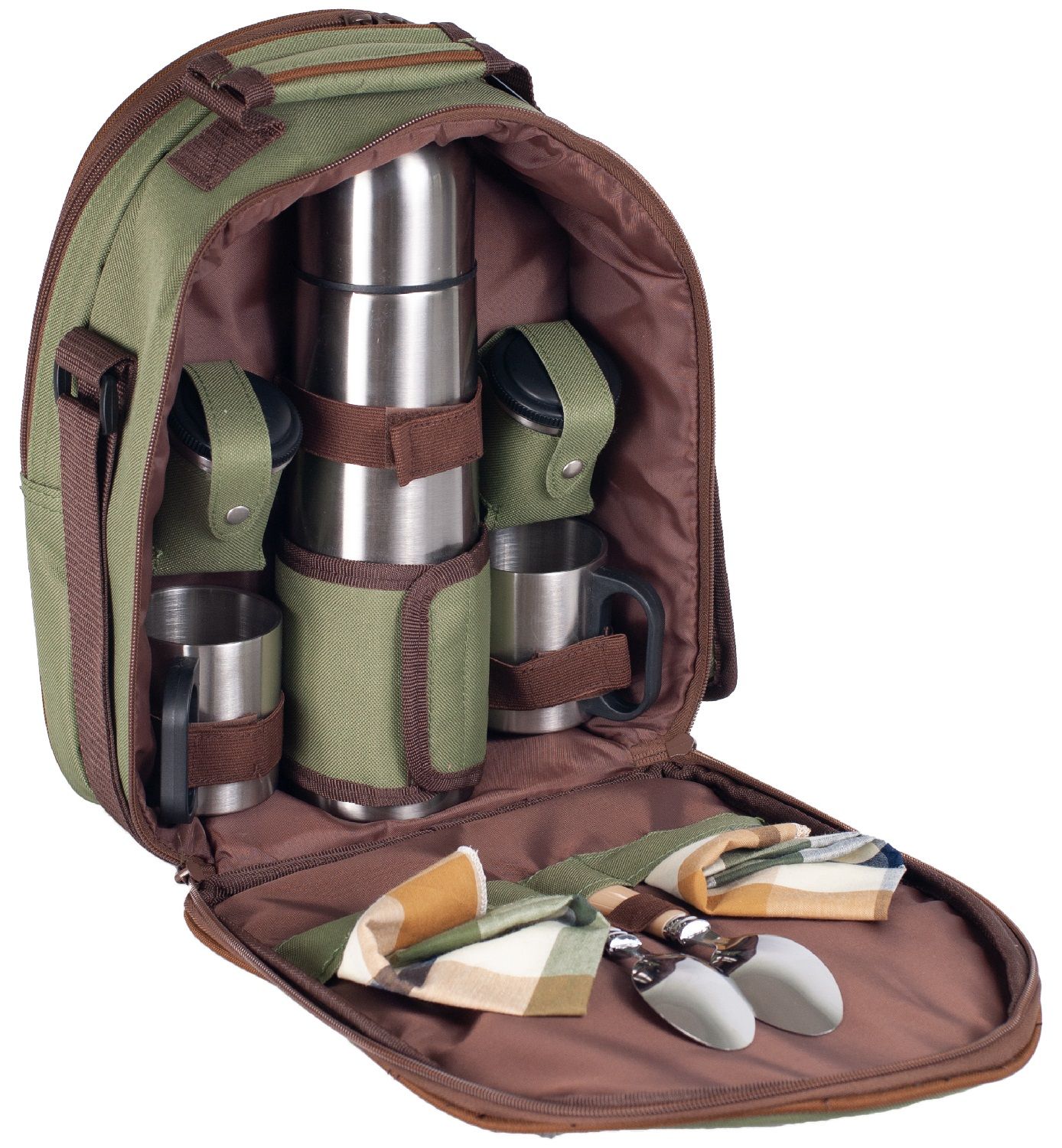 У сумці з ізотермічним відділом, знаходиться термос об'ємом 750 мл, металеві термокружки, контейнери для сипучих продуктів - зазвичай це: цукор і кава або чай, (або можна використовувати як чарки), а ще ложки з серветками. Ззаду передбачений невеликий термовідсік для зберігання продуктів. Попереду кишеня для преси або дрібниць.