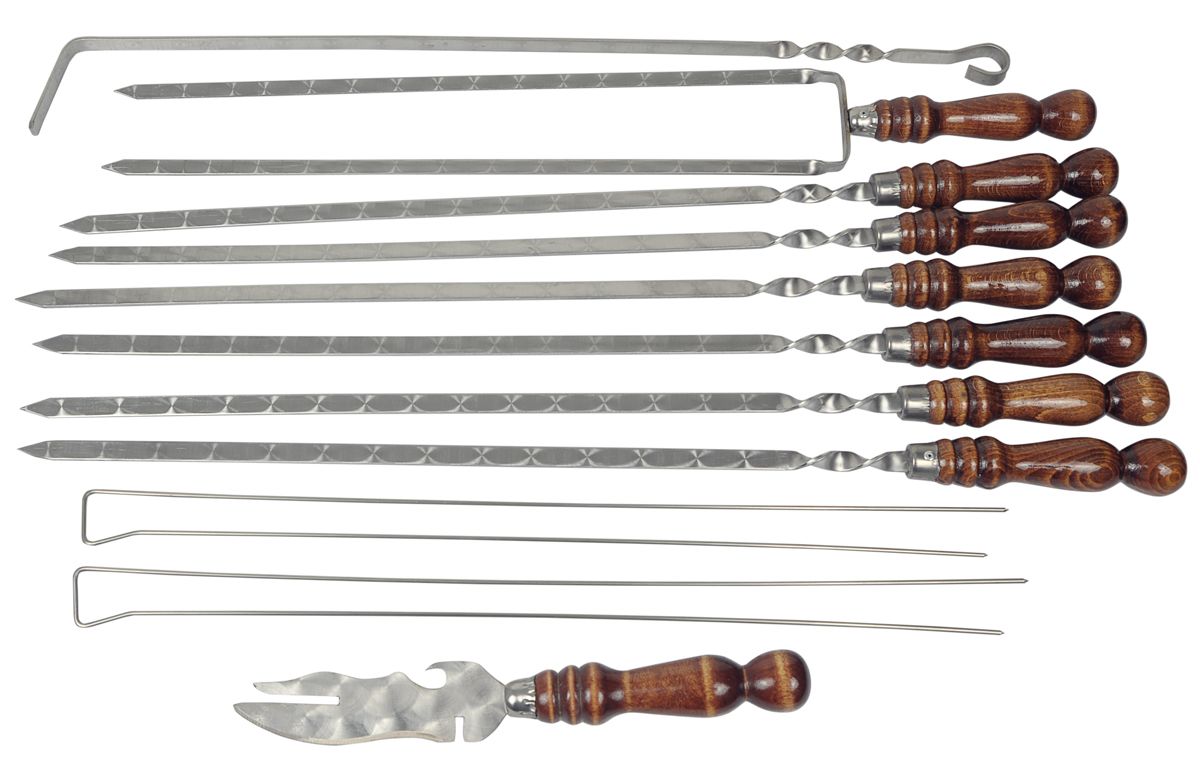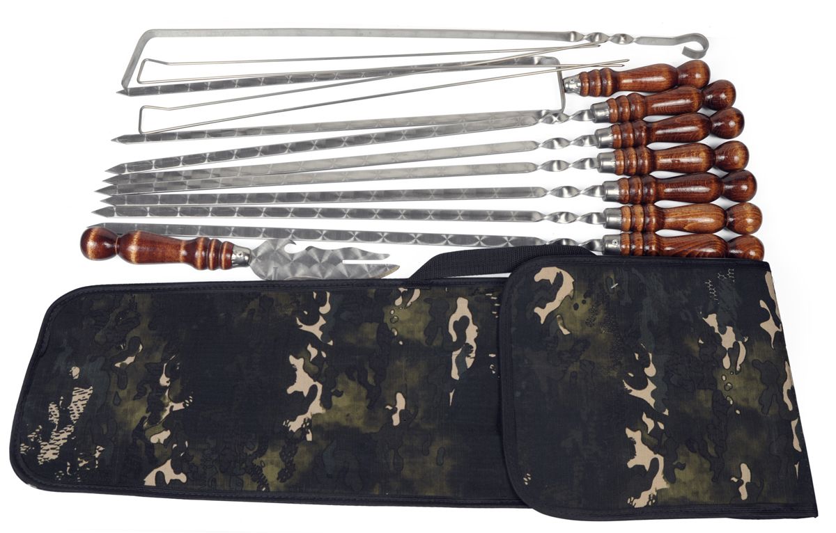 Набір шампурів – необхідний атрибут кожного пікніка. У ньому є все найнеобхідніше для смачного та комфортного відпочинку на природі: шампура, похідний мангал, кочерга, зручний чохол для зберігання та перевезення приладів із гострими лезами. Такий набір шампурів легший і компактніший, ніж у коробці, і досить презентабельний для подарунка.