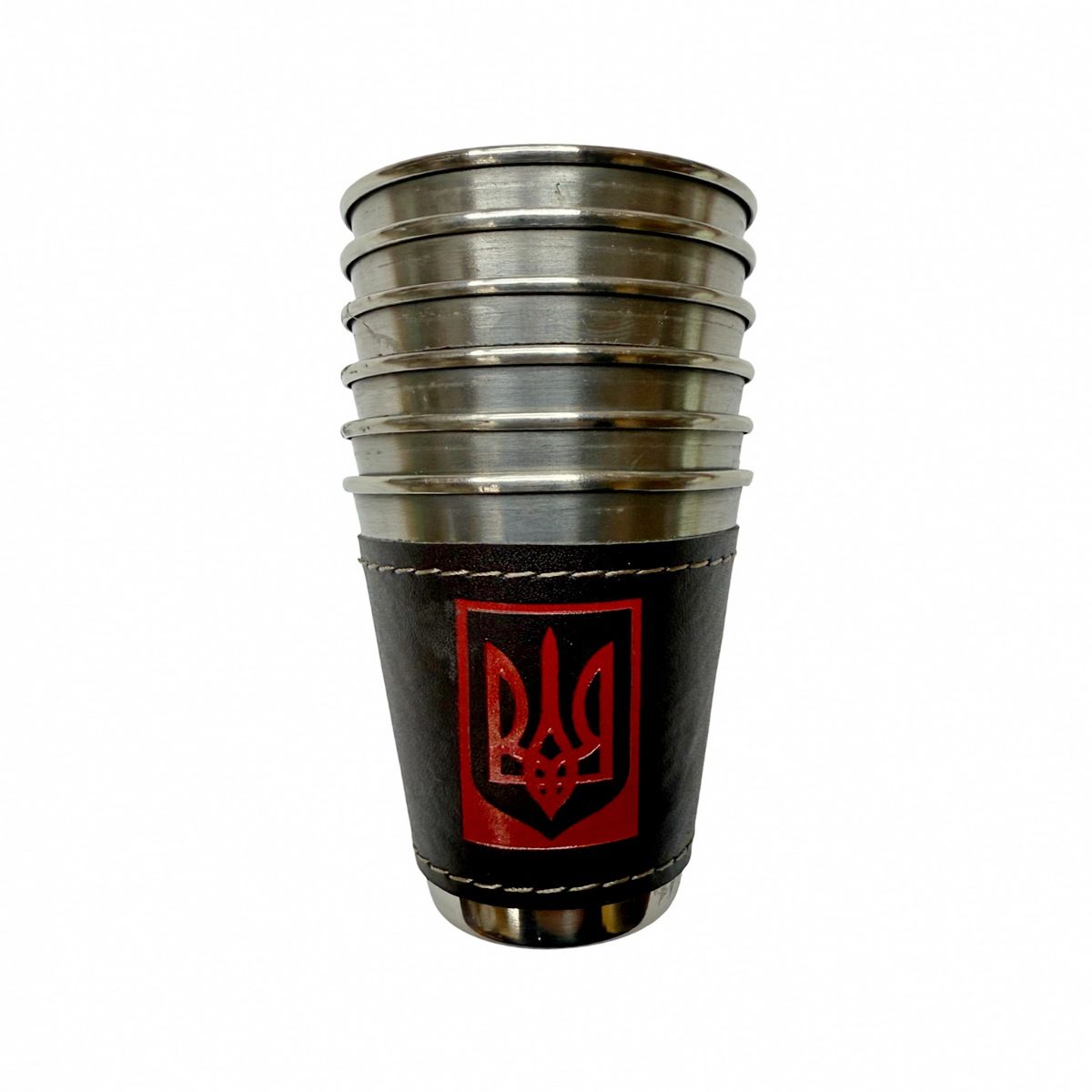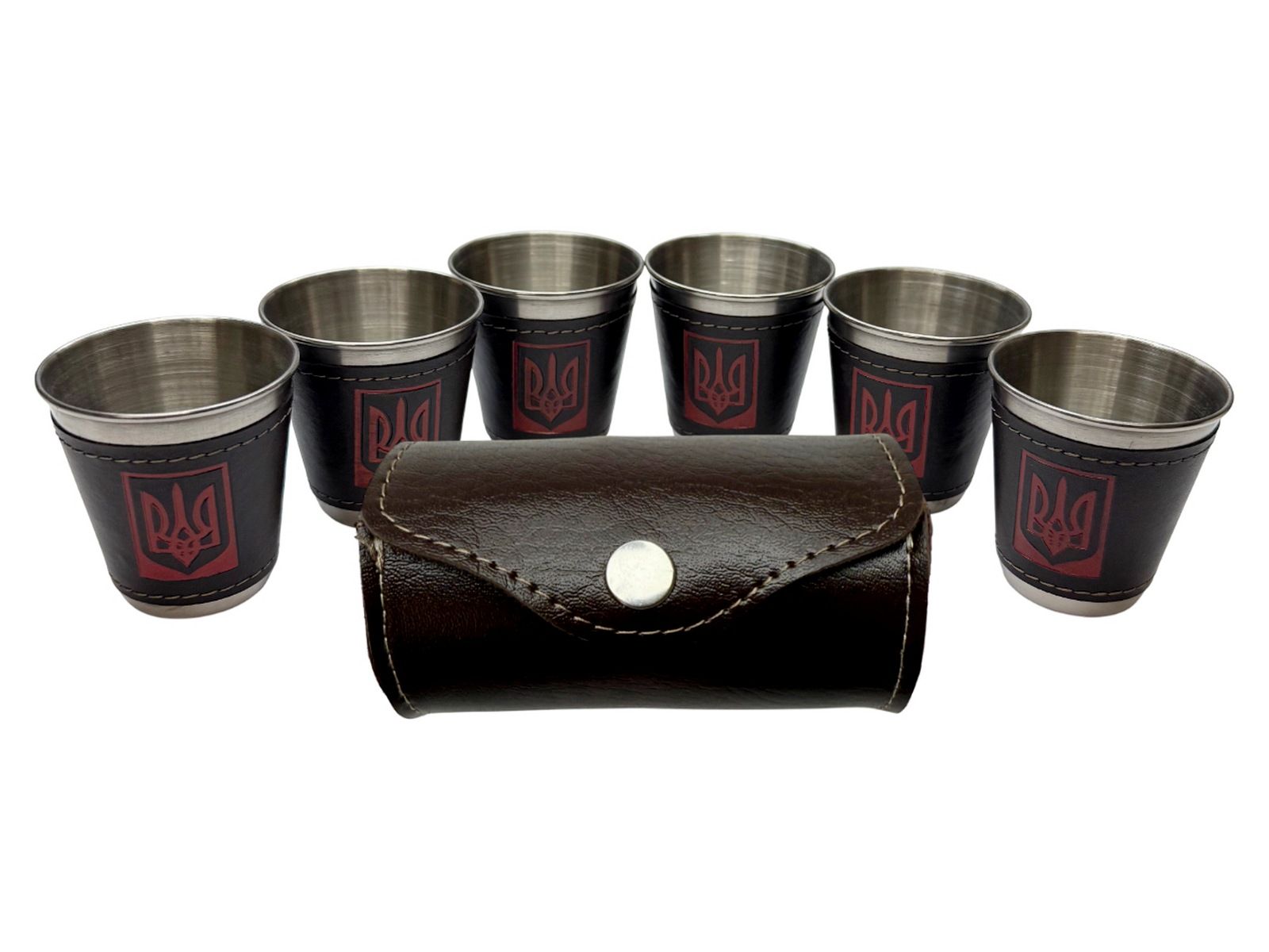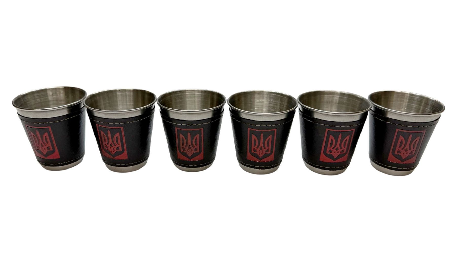 - стопки виготовлені з міцної нержавіючої сталі, обтягнуті екошкірою та прикрашені тризубом