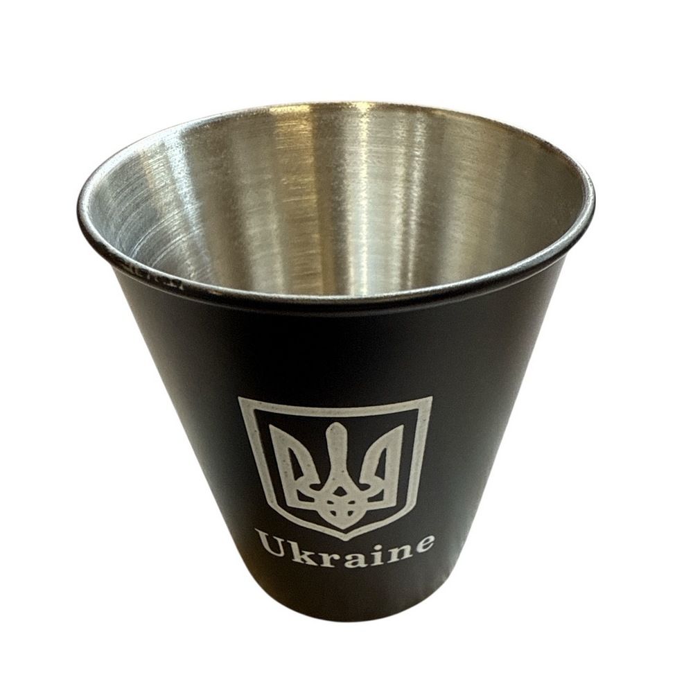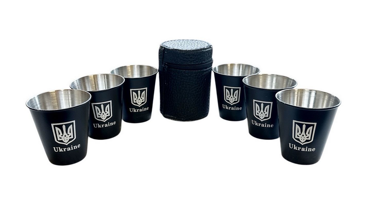 Подарунковий набір "Україна" включає 6 стопок об'ємом 75 мл кожна.Стопки виконані з нержавіючої сталі та обтягнуті екошкірою з нанесеним тризубцем та написом "Ukraine". Запаковані в чохол з екошкіри.