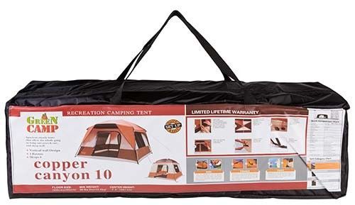 В намет Green Camp 10 вільно поміщаються шестеро дорослих людей. Намет має в наявності одне просторе відділення - спальне місце, яке має основний вхід і додатковий - ззаду. Основною перевагою намету, є його розмір (невеликої кімнати), сучасний дизайн. Намет провітрюється за допомогою циркуляції повітря усередині приміщення, що забезпечується двома клапанами для вентиляції. У наметі також є два вікна, які оснащені москітною сіткою для захисту від комарів, мошкари і інших дрібних комах, вікна із зовнішнього боку закриваються за допомогою замків. Шви палатки прошиті і проклеєні.