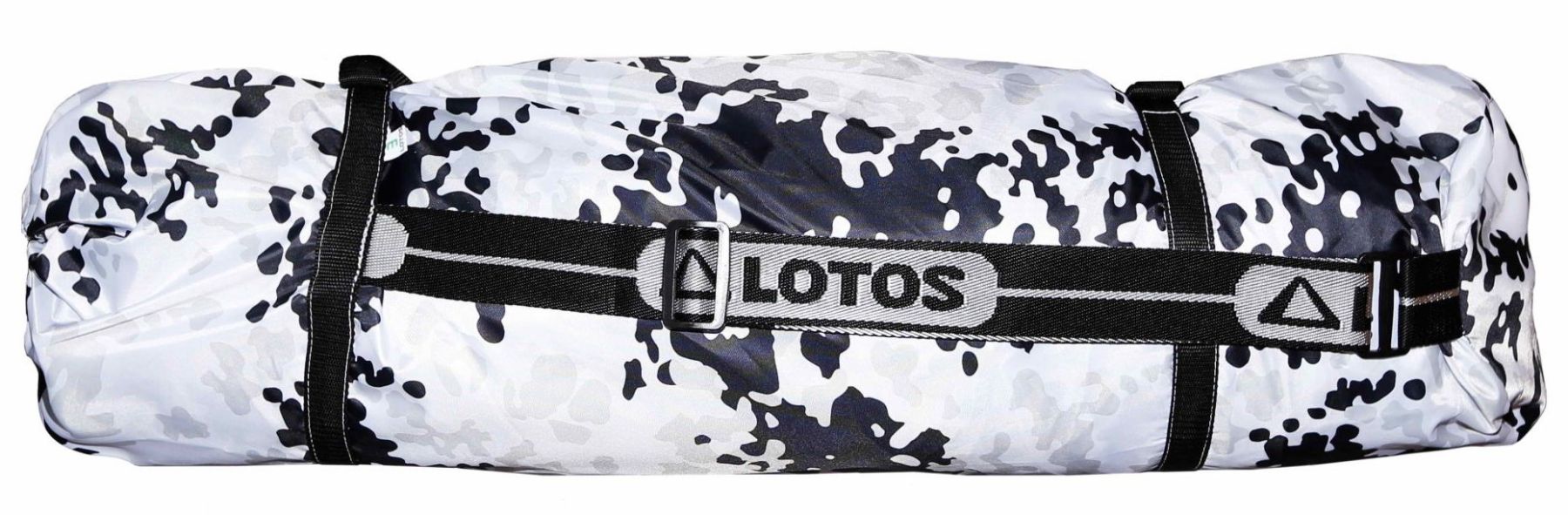 Виробник вирішив випустити намет не стандартного забарвлення, зимовий камуфляж! На ринку наметів для зими панують яскраві і помітні відтінки на тлі зимового пейзажу, але для тих, хто не бажає бути об'єктом пильної уваги, потрібно щось нове не помітне. У зимовому камуфляжі намету Лотос переважає білий колір і невеликий відсоток темного відтінку і сірих плям. Темні плями довільної форми приховують обриси маскувального намету на тлі зимового пейзажу, не даючи очам стороннього спостерігача зачепиться.