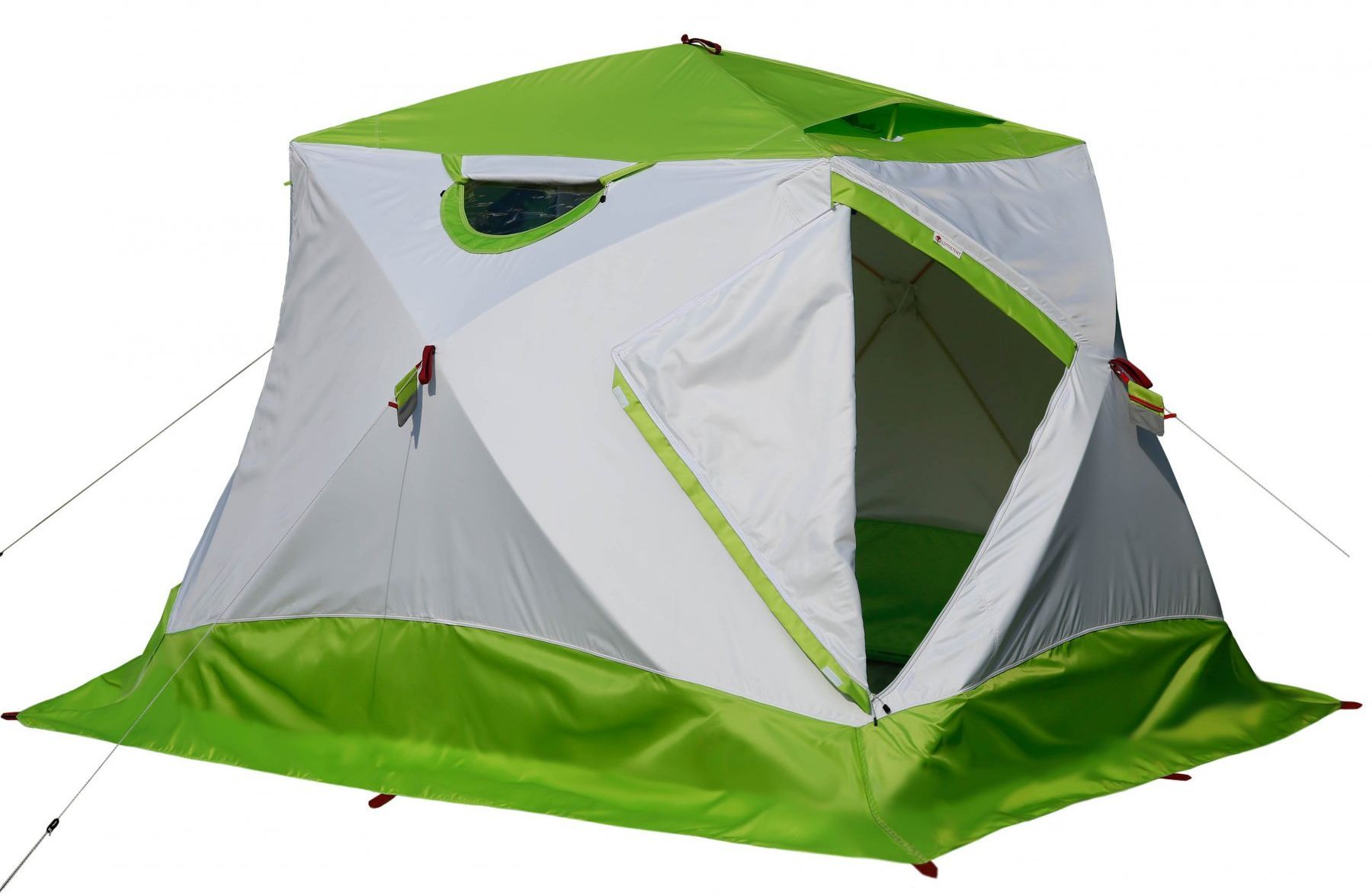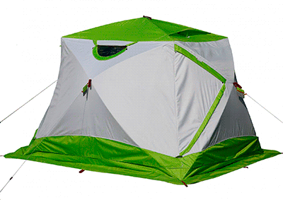 Забарвлення намети ЛОТОС Куб 4 Термо (лонг) виконана в білому кольорі з яскраво-салатовим вставками, і навіть в похмурий день в ній буде досить світло і затишно. Тришаровий тент має достатню світлову провідність, не вимагаючи додаткових вікон для освітлення. Безпека в нічний час забезпечують світловідбиваючі елементи на стінках намету.