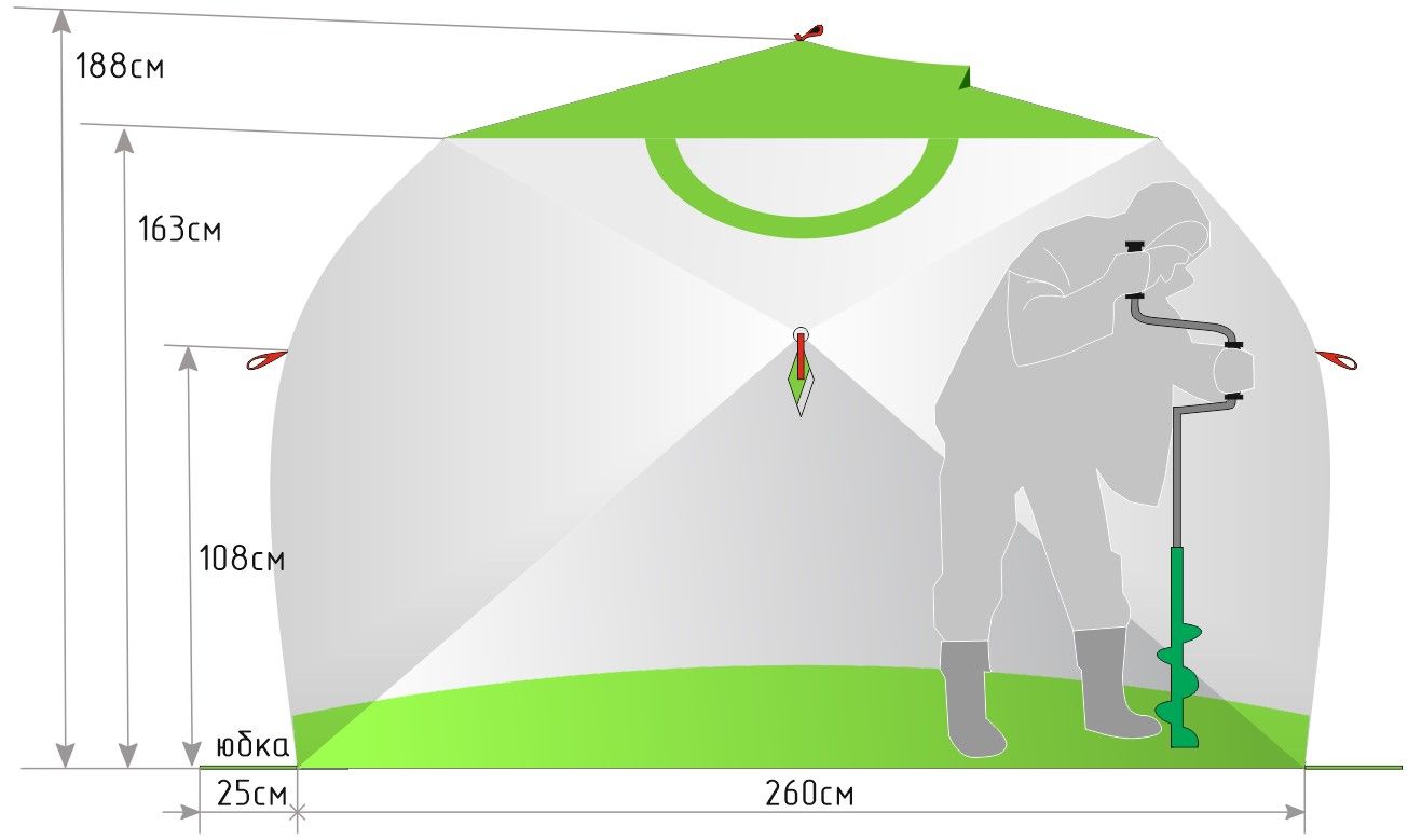 - Оптимальне співвідношення пропорцій конструкції! Висота палатки 188 см при ширині дна 260х210 см;