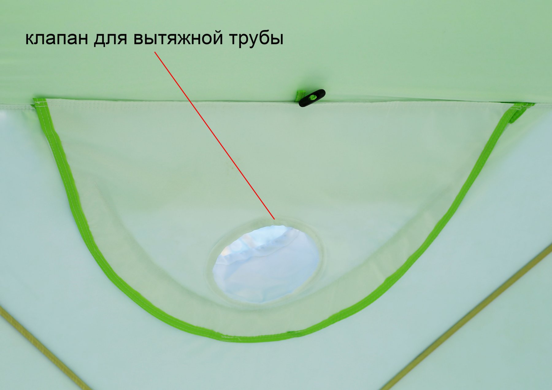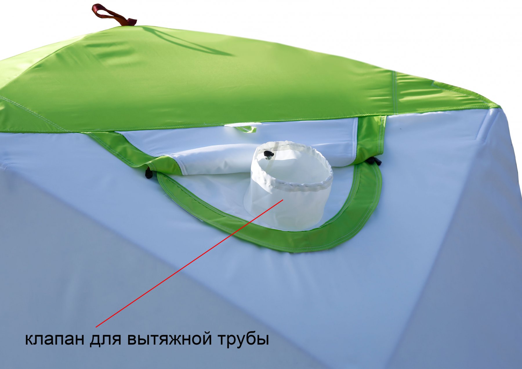 Знімний клапан під витяжну трубу теплообмінника виготовлений з міцної тканини Polyester Oxford 240D з тришарової утепленій основою. Клапан кріпиться до намету так само, як і знімне прозоре вікно. Система кріплення клапана у віконному отворі намету надійно фіксує його на тенті, дозволяючи складати намет разом з встановленим на ній клапаном.