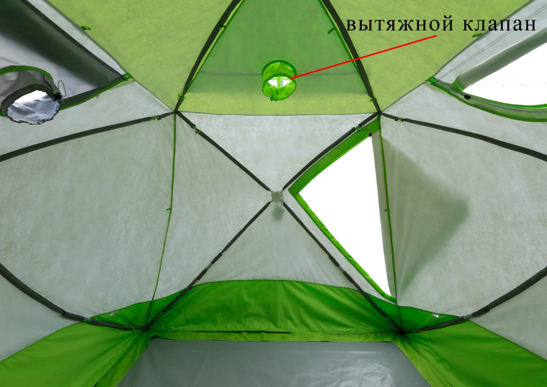 - Гідро-термоізоляційне дно з отворами під лунки забезпечує надійну гідроізоляцію і термоізоляцію підлоги і нижнього периметра палатки, захищаючи поверхню підлоги від затікання води через лунки (опція);