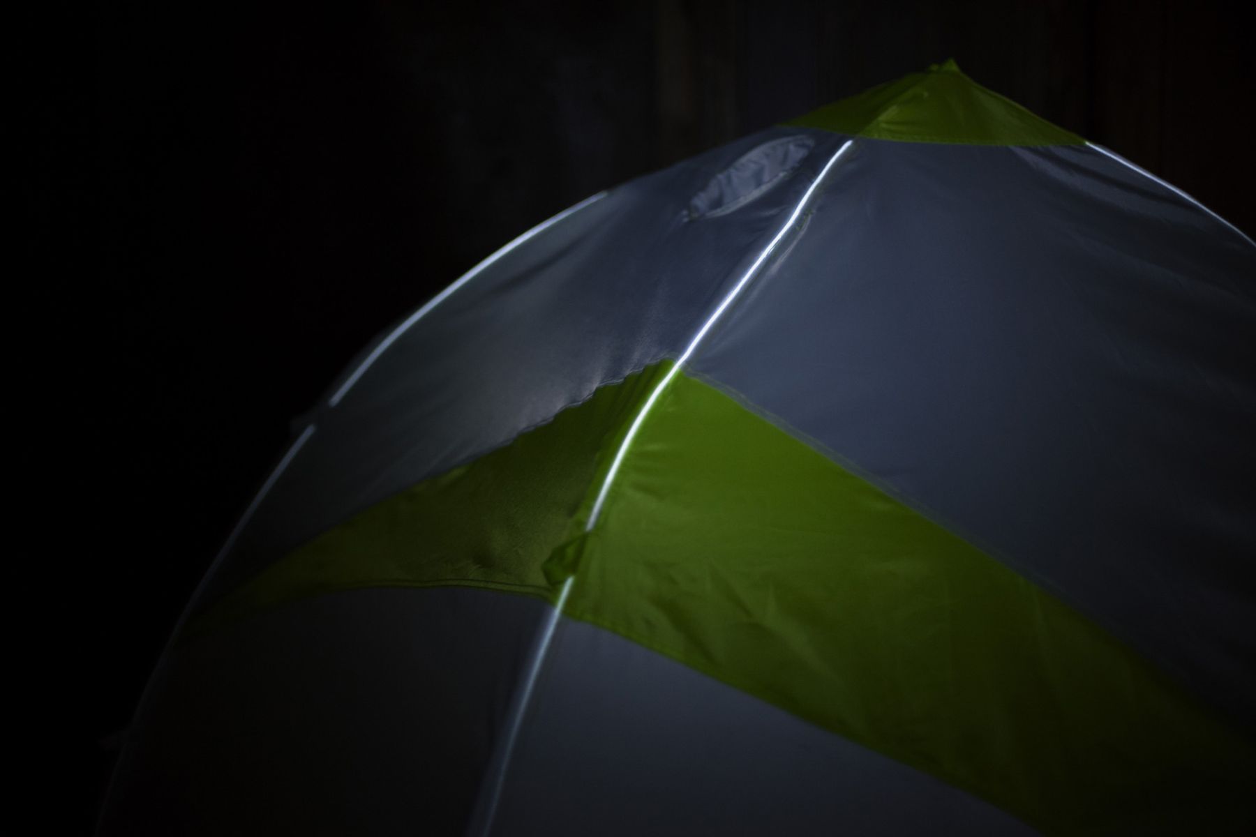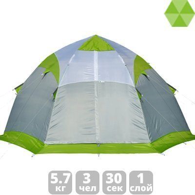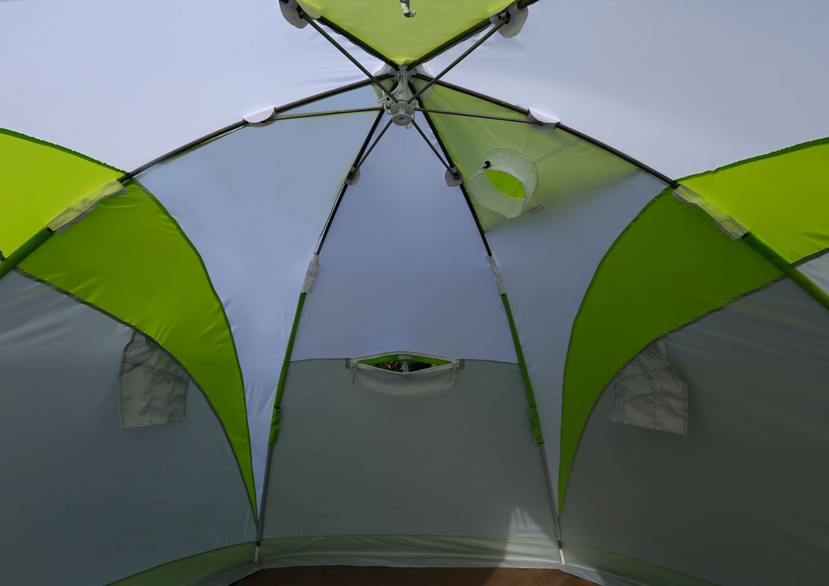 Забарвлення намету виконано в яскраво-салатовому кольорі, і навіть в самий похмурий день в ній буде завжди світло і затишно. Для безпеки в нічний час передбачені світловідбиваючі окантовки ребер і розтяжки.