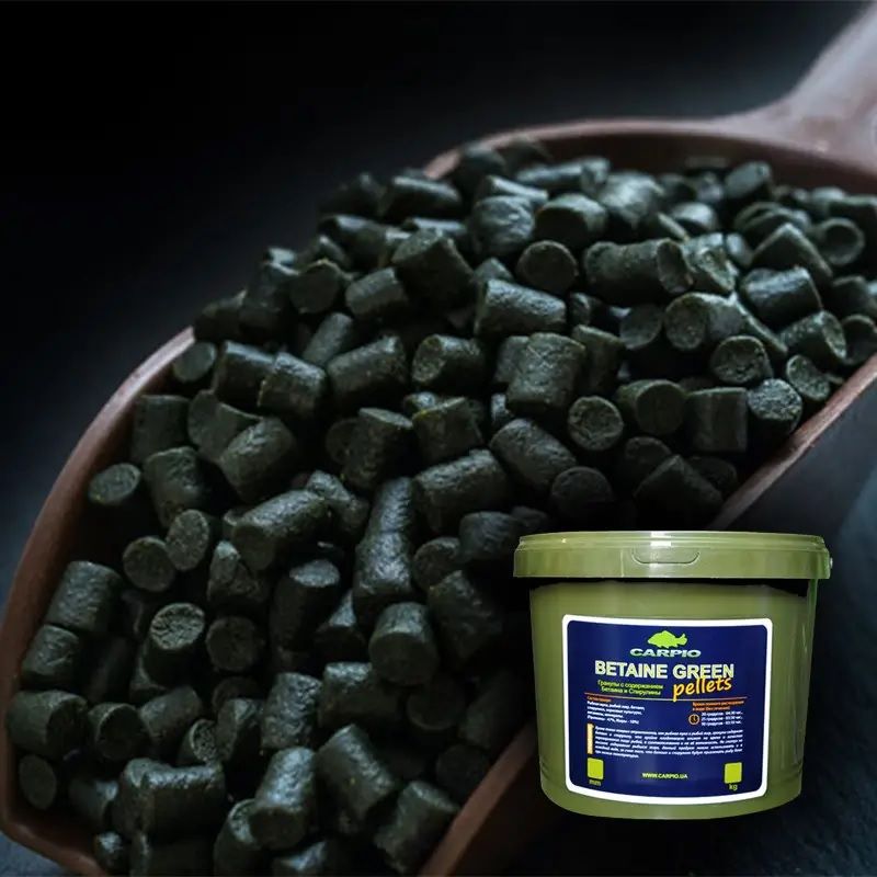 Гранули BETAINE GREEN містять 47% протеїну та 18% жиру. Виготовлені з високоякісного (Чилі, Перу) рибного борошна, риб'ячого жиру, суміші зернових культур. Містять вітаміни, мінерали, спіруліну, бетаїн. Крім таких потужних атрактантів, як рибне борошно та риб'ячий жир, гранули додатково залучають коропа бетаїном та спіруліною, які і собі вкрай плідно впливають на час та якість перетравлення їжі рибою, а відповідно і на її активність.
