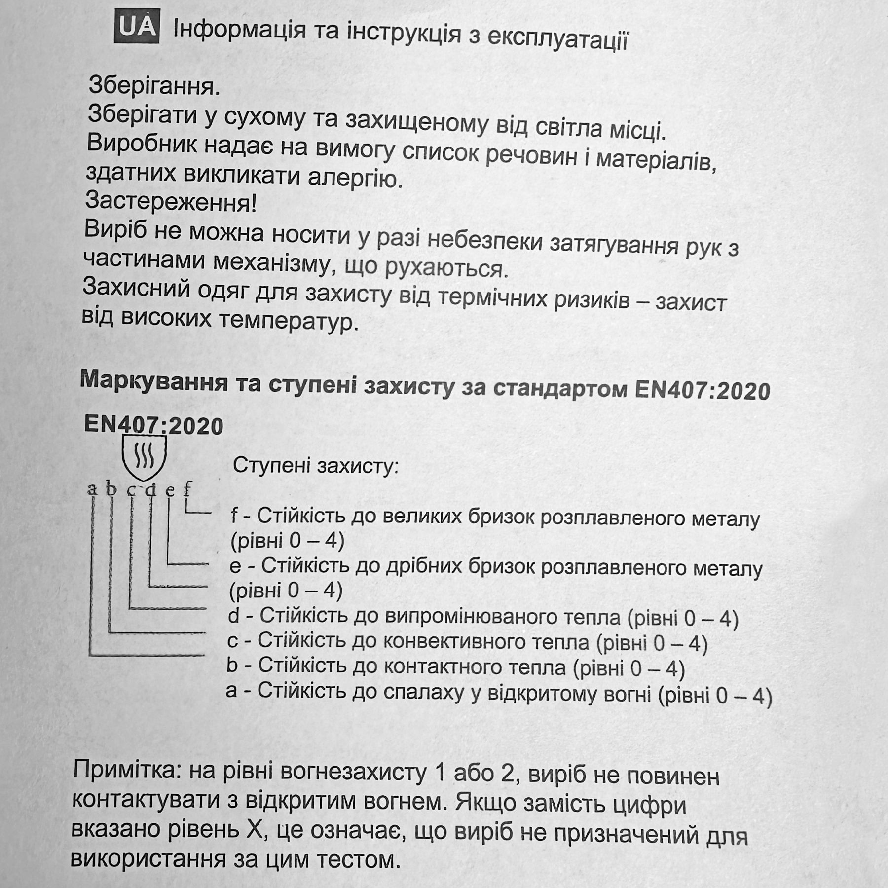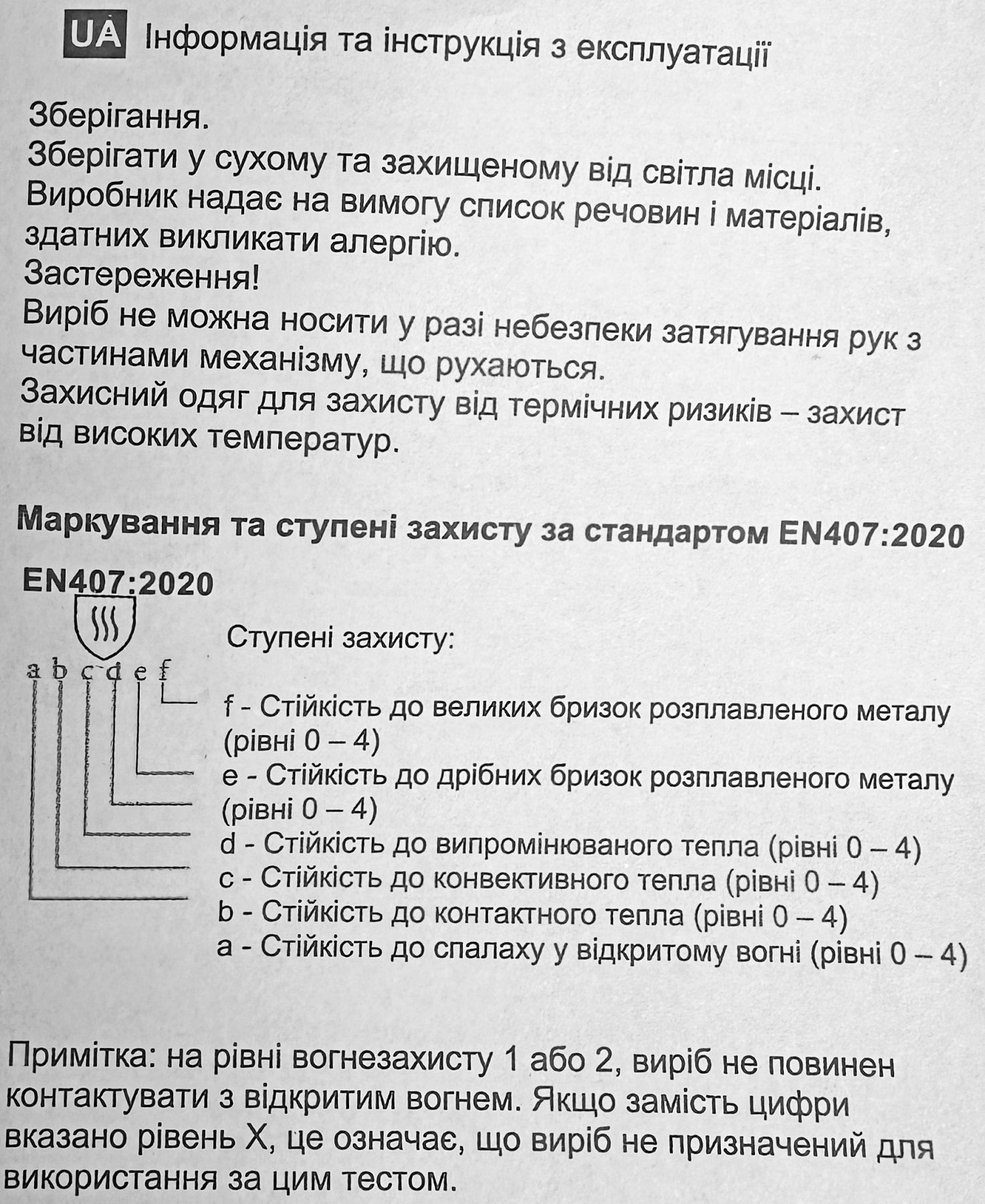 - Ступінь захисту за стандартом EN407:2020
