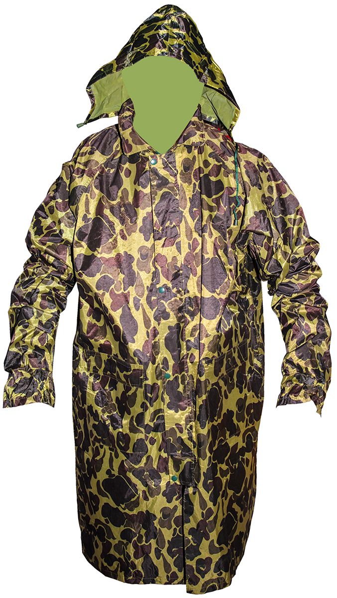 Плащ-дощовик з тканини в складі якої 30% ПВХ і 70% поліестеру забарвлення камуфляж, дасть Вам 100% захист від дощу і вітру. Даний плащ застібається на блискавку і кнопки, він оснащений глибоким капюшоном на шнурівці. Всі шви дощовика проклеєні термо стрічкою, таким чином, виключаючи можливість попадання вологи ззовні. Забарвлення плаща-дощовика прекрасно поєднується з будь-якими типами місцевості.