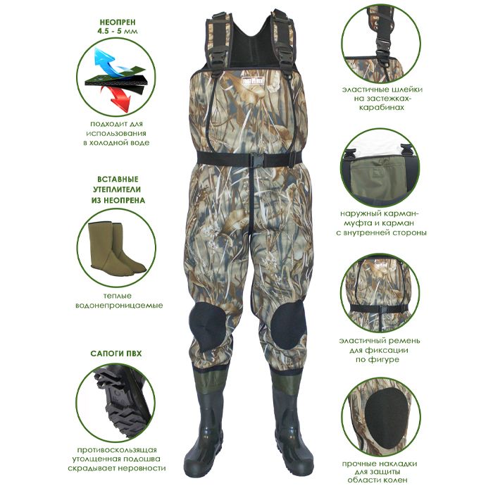 Особливістю цієї моделі комбінезона є те, що верхня частина виконана з неопрену. Цей сучасний матеріал володіє низькою теплопровідністю і гігроскопічністю, при цьому він міцний і еластичний. Цей матеріал використовується при виготовленні гідрокостюмів для роботи під водою в умовах низьких температур. У порівнянні з напівкомбінезонами з ПВХ він більш комфортний - не обмежує руху і теплий - в порівнянні з ПВХ нижчий коефіцієнт тепловіддачі. Має міцну підошву, яка дозволить впевнено ходити по поверхні покритої гострою черепашкою або агресивними загостреними каменями. Оснащений шлейками, обладнаними карабін фіксатором, що дозволить ідеально відрегулювати виріб під Ваш зріст. Також може бути відрегульований за повнотою, тому підійде людині з практично будь-якою комплекцією. Має внутрішню і зовнішню кишеню, що дозволяє розмістити необхідні речі компактного розміру. Відмінно підійде для носіння восени, навесні і влітку.
