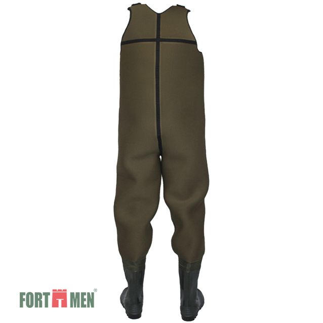 Технологічний спосіб з'єднання верхньої частини з неопрена і чобіт з ПВХ забезпечує з'єднувальному шву водонепроникність і міцність при посиленому натягуванні чобіт за халяву. Шов з'єднання і шви крою проклеєні водостійким клеєм і в стик і внахлест, і загерметизовані спеціальною стрічкою і з внутрішньої і зовнішньої сторін напівкомбінезона. Крій виробу продуманий з цільновикроєних деталей з мінімальною кількістю швів, що мінімізує найбільш вразливі для утворення протікання місця.