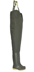 Напівкомбінезон з регульованими по висоті лямками і пластиковим роздільником на спині, зручною внутрішньою кишенею. Напівкомбінезон виготовлений з водонепроникного матеріалу (трикотажного полотна просоченого ПВХ) і приварений до чобіт.