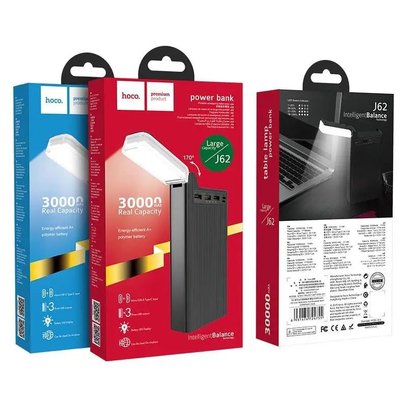 Power Bank Hoco J62 - надзвичайно потужна портативна батарея місткістю 30000mAh, оснащена LED лампою та може заряджати три пристрої одночасно! Power Bank HOCO J62 30000mAh – універсальний УМБ.