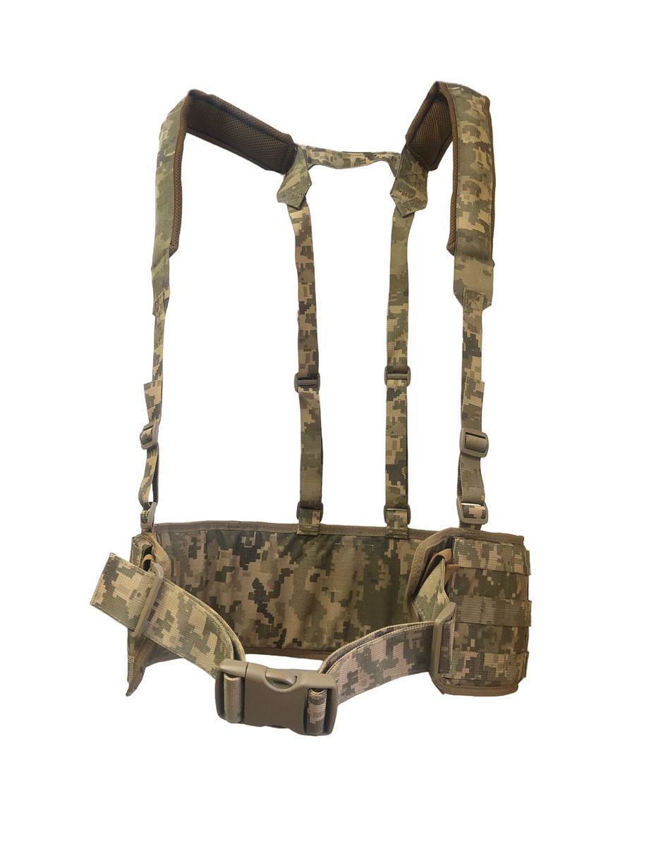 Пояс охоплює коло тулуба. Має пристрочені ремінні кінці, що з'єднують пояс у центральній частині за допомогою фастексного замку. Замок, крім основної роздвоєної клямки, має стопорну кнопку для запобігання несанкціонованому розтину. Ремінні стрічки регулюються по довжині двощілинними пластиковими пряжками. Вільні кінці фіксуються стрічкою на текстильній застібці «липучці». Пояс розділений на секції, по всій довжині, забезпечені трьома рядами строп під систему Молле. Вони пришиті до пояса у верхній та нижній частинах, тоді як бічні сторони надають вільний доступ усередину. Найдовша поясна секція – задня, зроблена у вигляді клапана, що закривається в нижній частині на текстильну застібку «липучку».