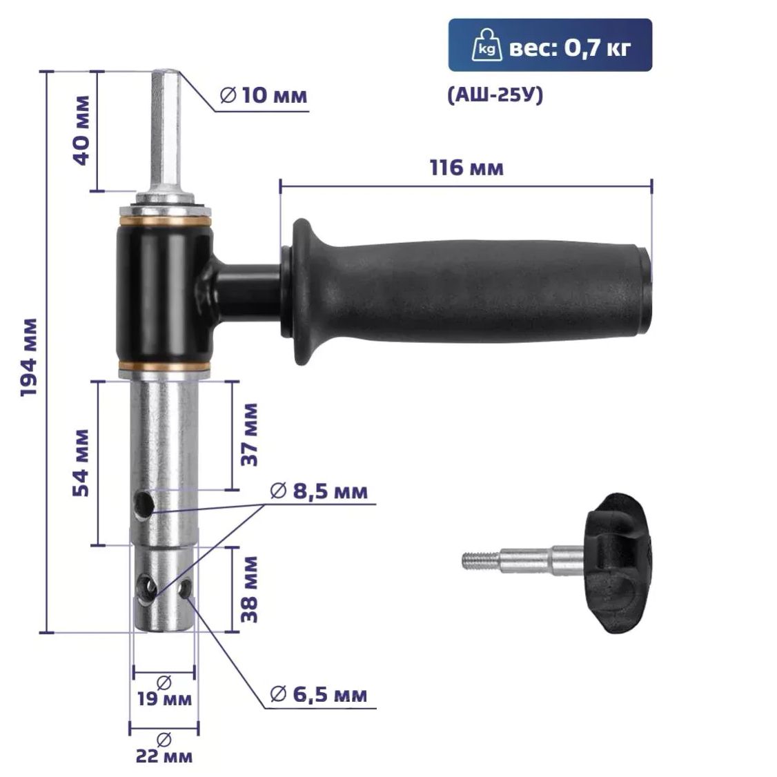 - винт-барашек с резьбой М6 (отверстие 6,5 мм) для присоединения к ледобурам ТОРНАДО-М2, BURAN и к удлинителю УА-400 для ледобуров ТОНАР и Helios;
