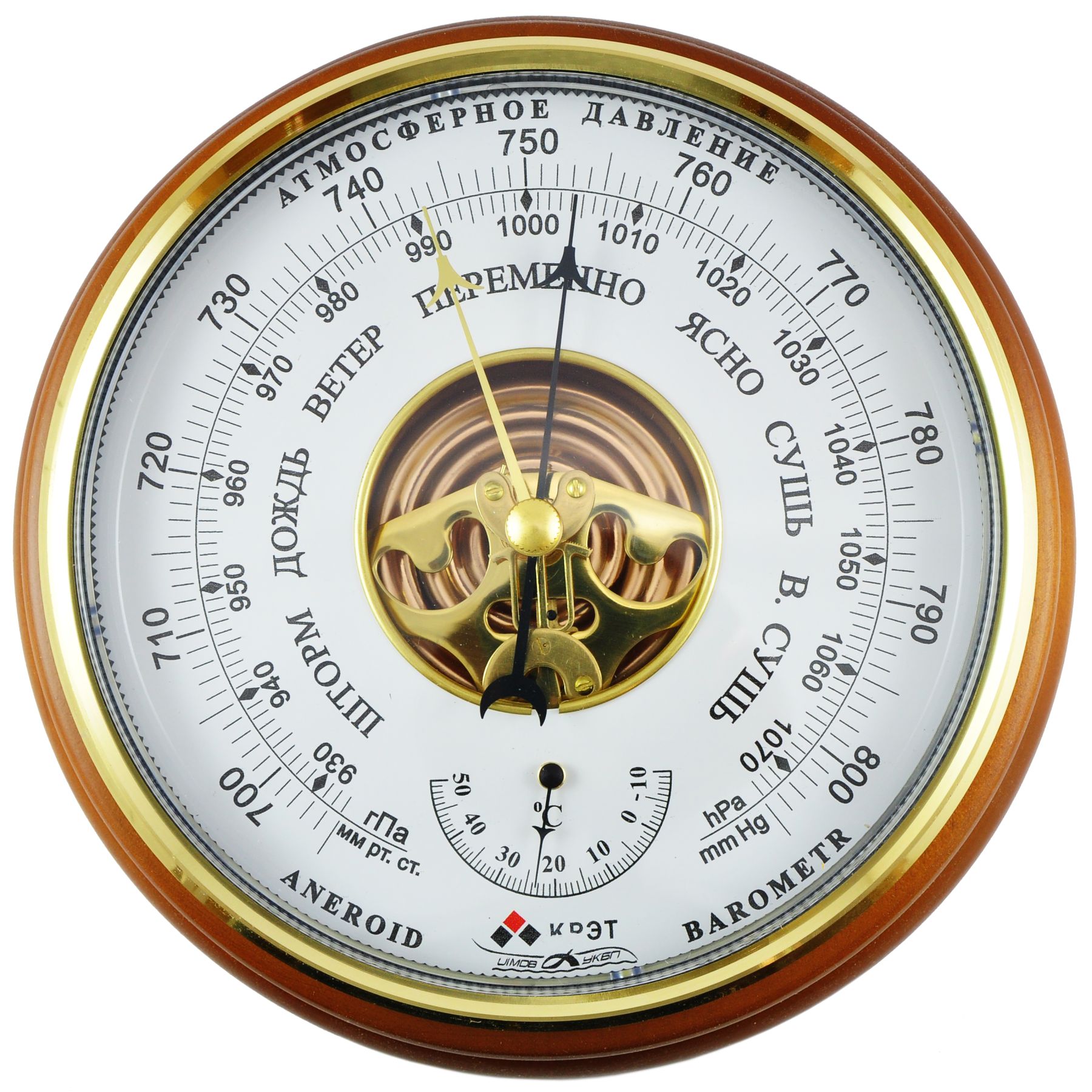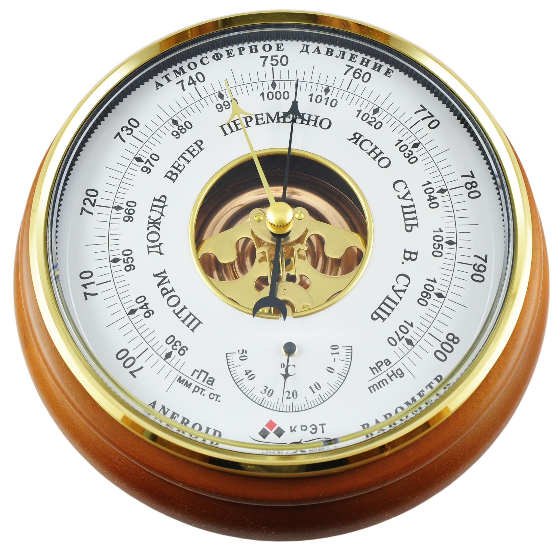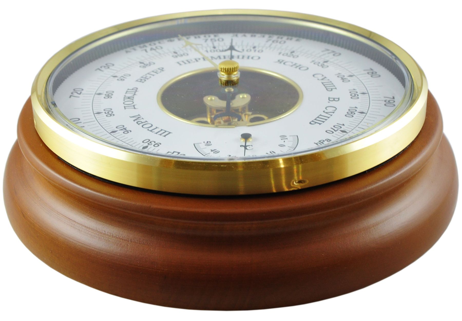 Шкала прибора выполнена в светлой цветовой гамме, градуировка нанесена чёрным цветом. Корпус барометра изготовлен из натурального дерева (берёза).