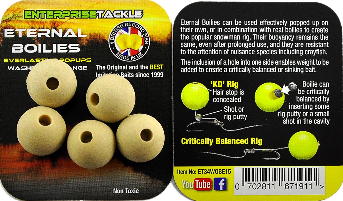 Включение отверстия в одну сторону позволяет добавить вес, чтобы создать критически сбалансированную или тонущую приманку. Вечные бойлы могут эффективно использоваться самостоятельно и в сочетании с настоящими бойлами, чтобы создать популярную оснастку Critically Balanced Rig, или как полуприманку с половиной настоящего бойла. Их плавучесть остается такой же, даже после длительного использования, и они устойчивы к воздействию раков.