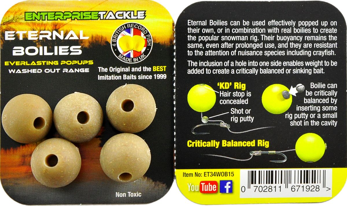 Включение отверстия в одну сторону позволяет добавить вес, чтобы создать критически сбалансированную или тонущую приманку. Вечные бойлы могут эффективно использоваться самостоятельно и в сочетании с настоящими бойлами, чтобы создать популярную оснастку Critically Balanced Rig, или как полуприманку с половиной настоящего бойла. Их плавучесть остается такой же, даже после длительного использования, и они устойчивы к воздействию раков.