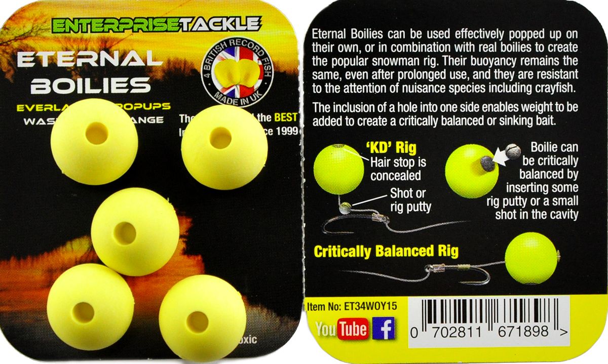 Включение отверстия в одну сторону позволяет добавить вес, чтобы создать критически сбалансированную или тонущую приманку. Вечные бойлы могут эффективно использоваться самостоятельно и в сочетании с настоящими бойлами, чтобы создать популярную оснастку Critically Balanced Rig, или как полуприманку с половиной настоящего бойла. Их плавучесть остается такой же, даже после длительного использования, и они устойчивы к воздействию раков.