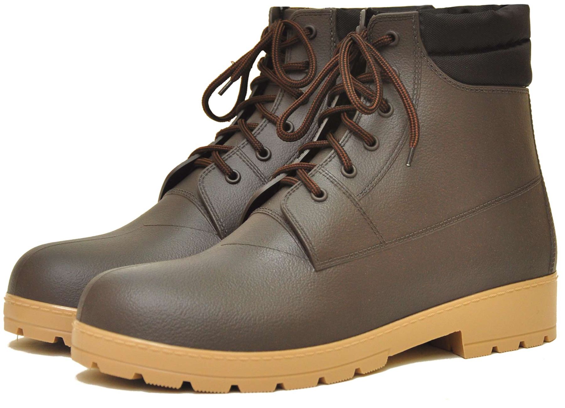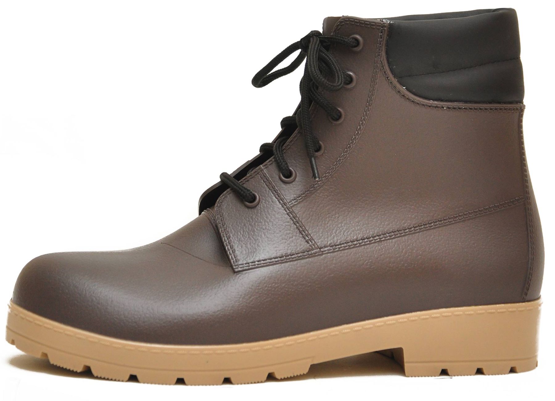 Внешняя часть выполнена из высококачественной резины, которая благодаря особой обработке внешне практически не отличается по виду от натуральной кожи. Для того, чтобы обеспечить ногам максимальный уровень комфорта в районе щиколотки предусмотрено наличие мягкой вставки. Имеют толстую подошву с глубоким протектором, который обеспечит идеальное сцепление с любой поверхностью и защитит от проколов и порезов.